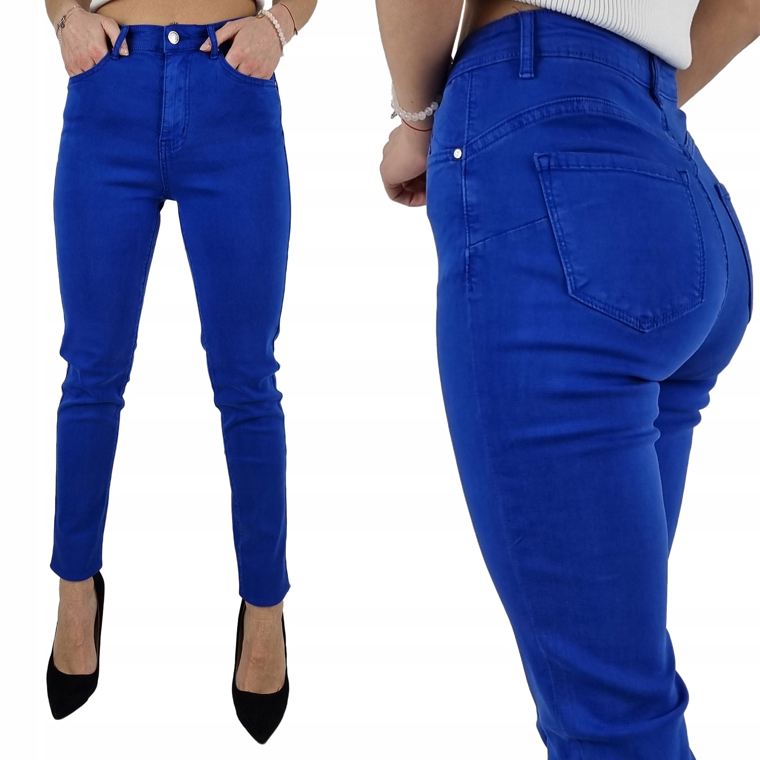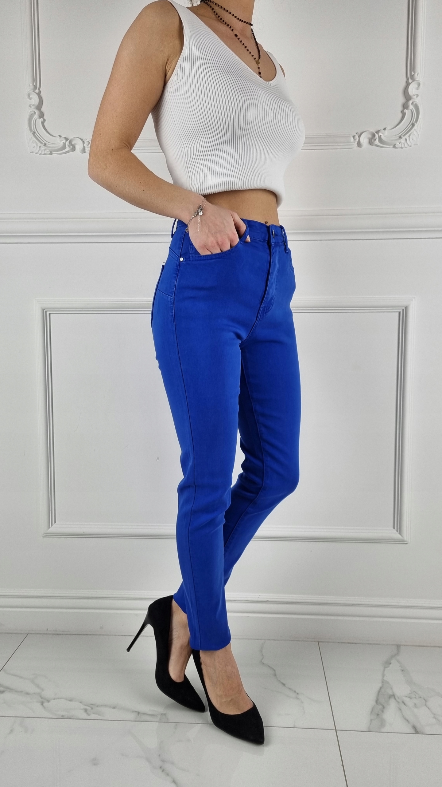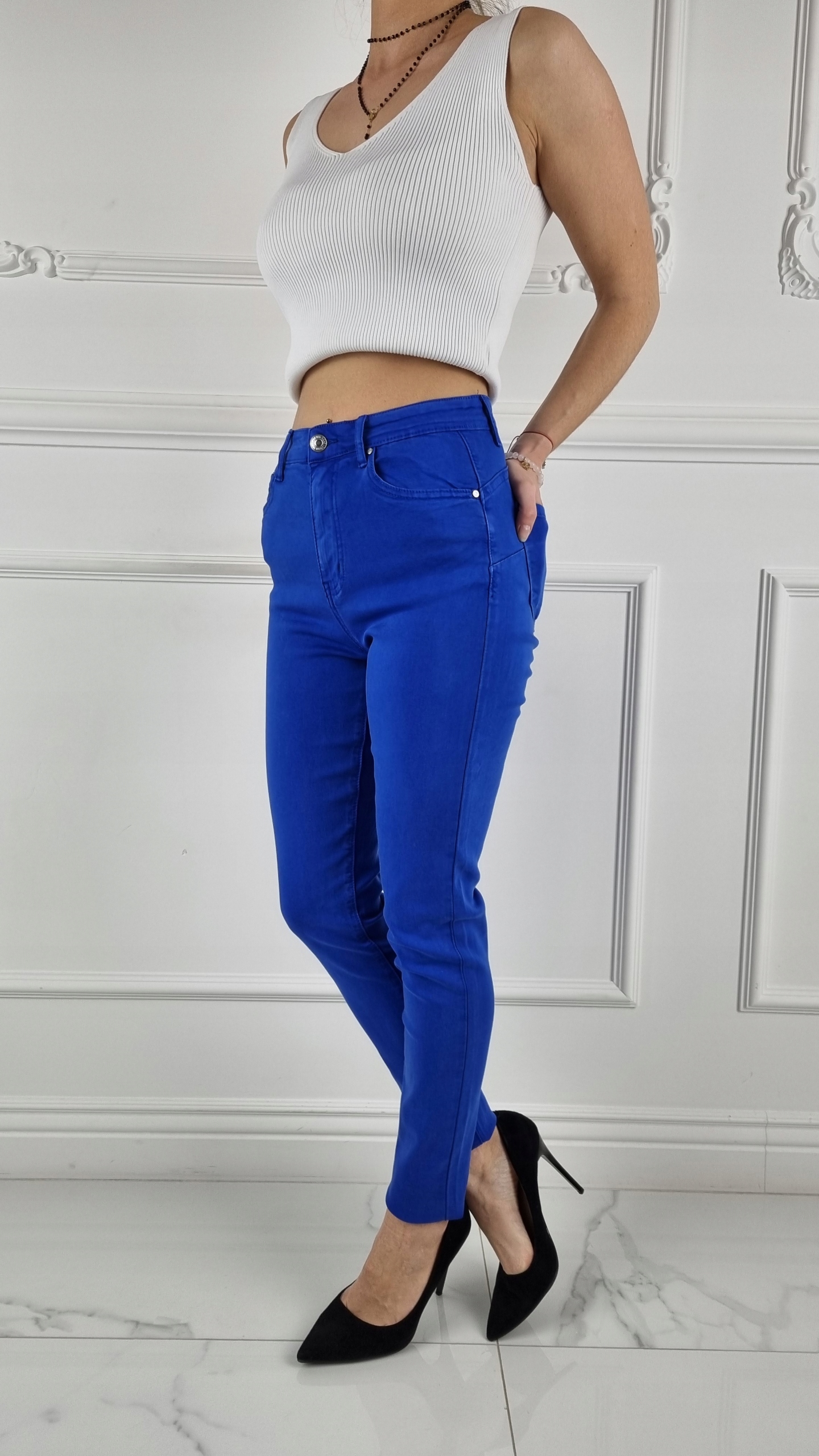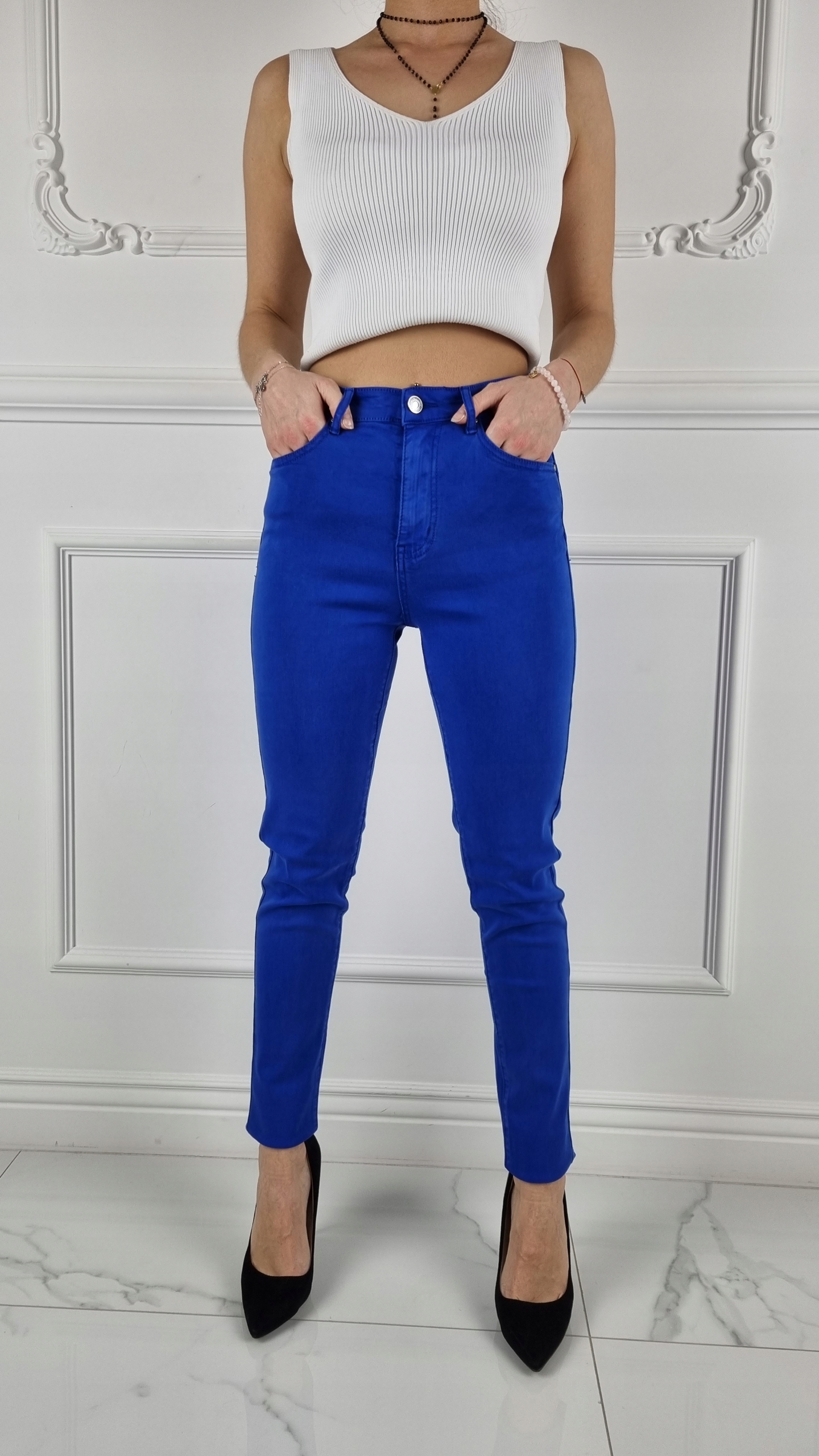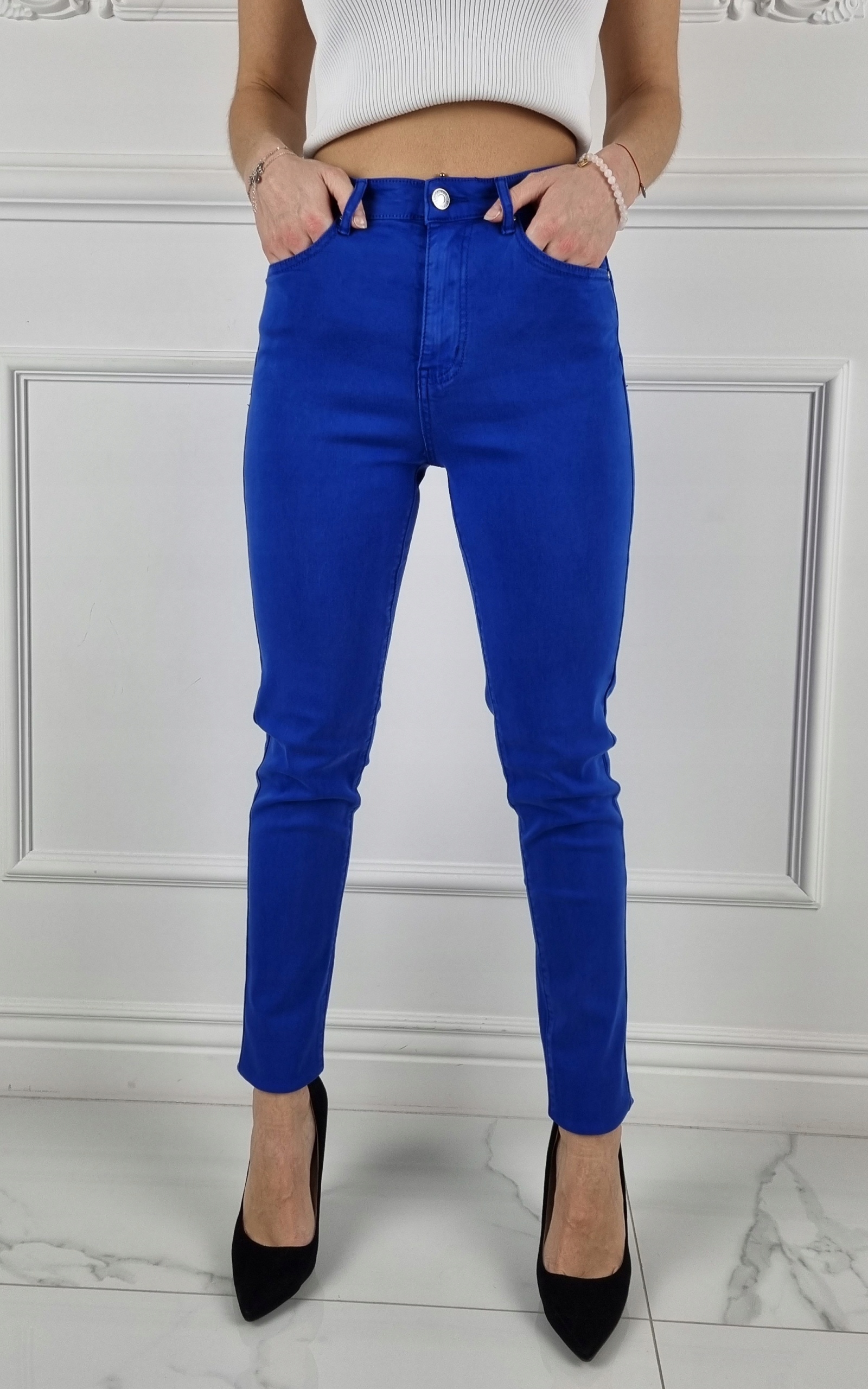 Отличные брюки василькового цвета с завышенной талией. > Отлично подходят для спортивной обуви, но также идеальны в сочетании с обувью на высоком каблуке, поскольку благодаря своей универсальности подходят практически к любому стилю. Гибкий материал подчеркивает женскую фигуру. Брюки приталенные и тянутся. Подчеркните свои женственные формы! Сделайте свой повседневный образ уникальным. Брюки имеют карманы с обеих сторон.