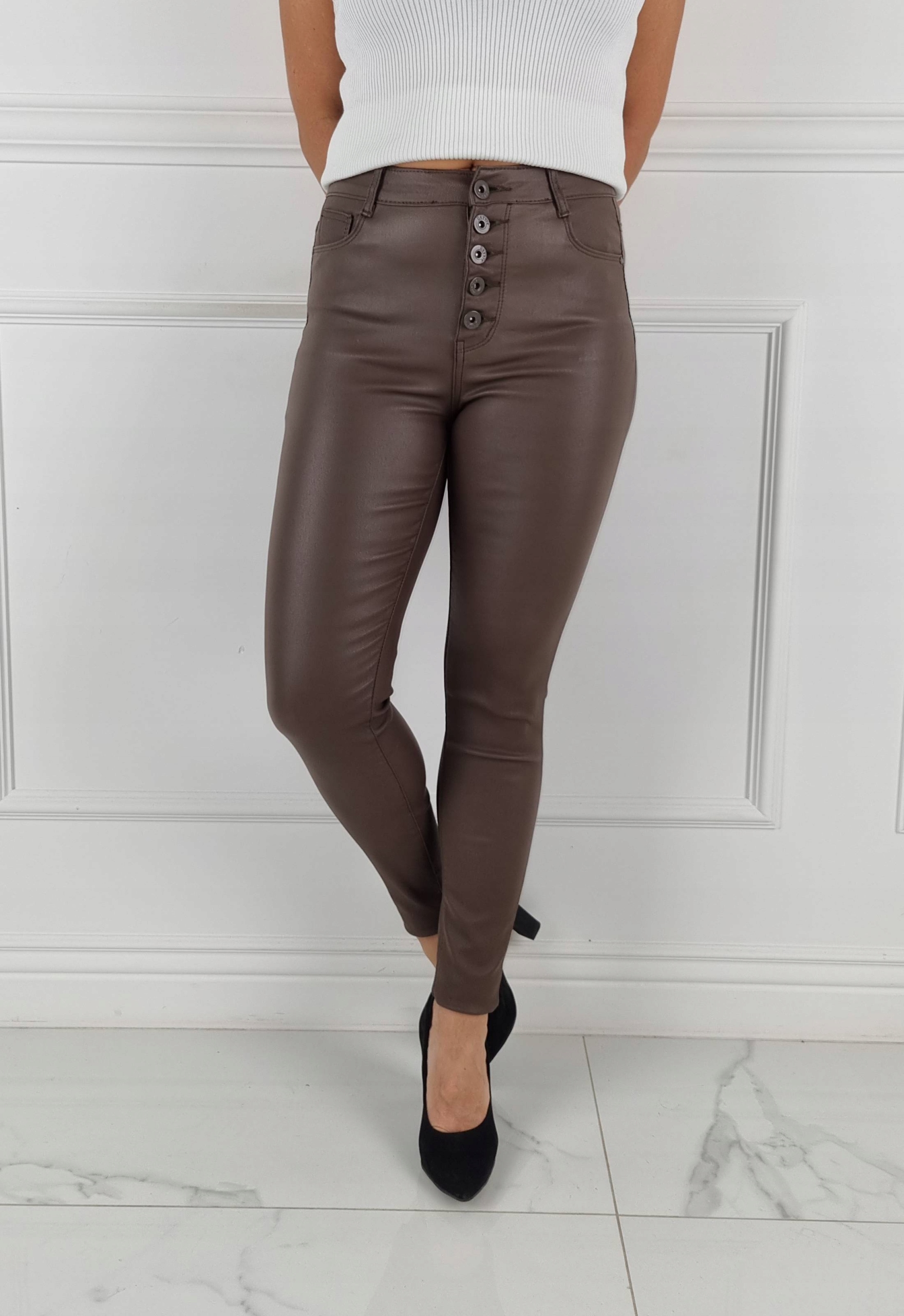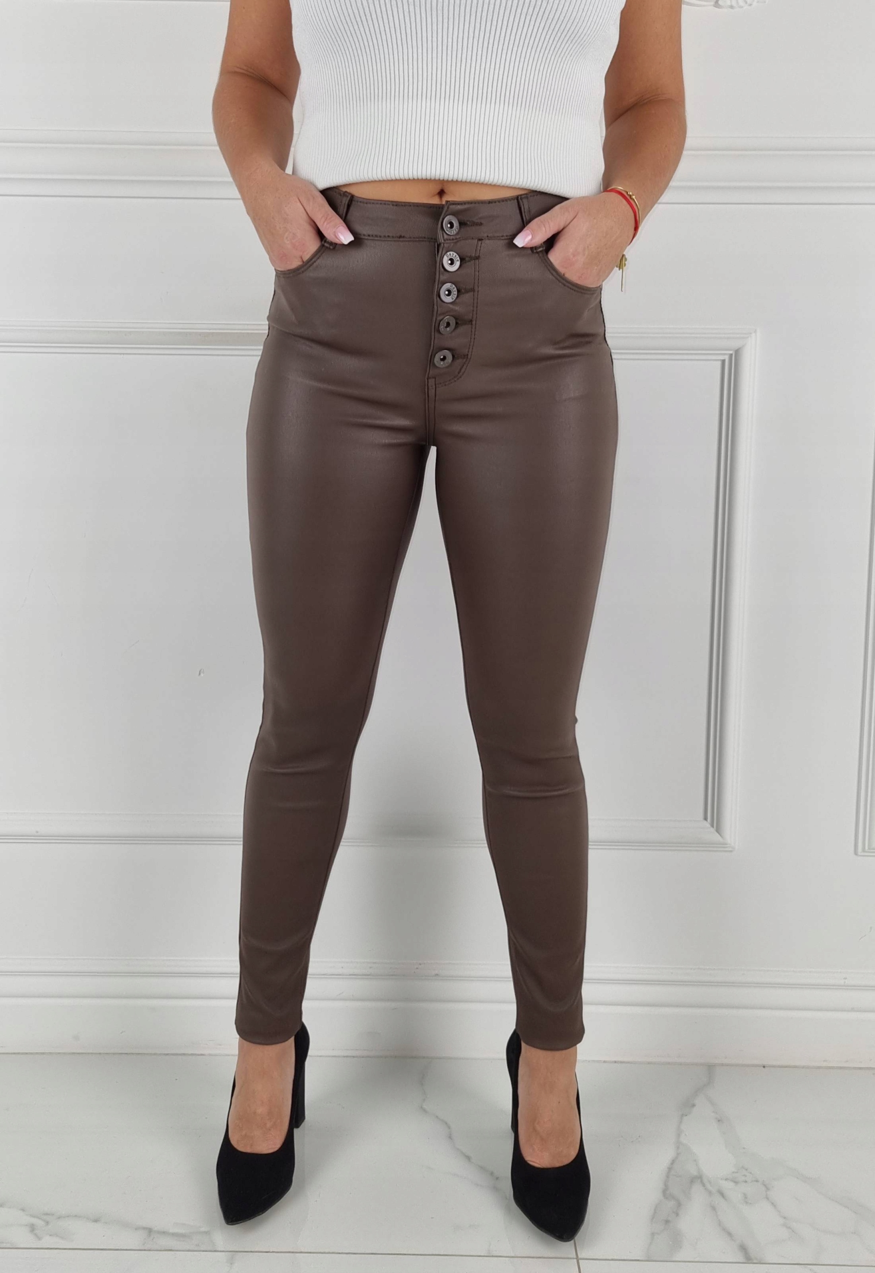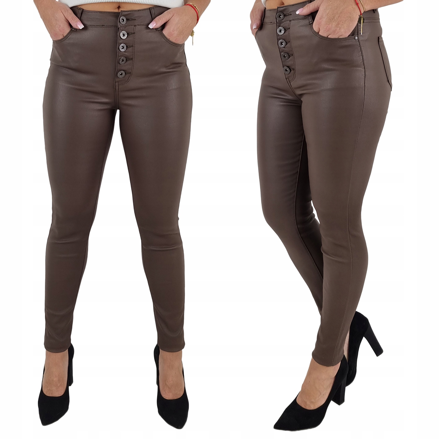 Отличные классические брюки, вощеные, матовыепод кожу, с завышенной талией. б> Отлично подходят для спортивной обуви, но также идеальны в сочетании с обувью на высоком каблуке, поскольку благодаря своей универсальности подходят практически к любому стилю. Гибкий материал подчеркивает женскую фигуру. Брюки приталенные и тянутся. Подчеркните свои женственные формы! Сделайте свой повседневный образ уникальным. Брюки имеют карманы с обеих сторон.