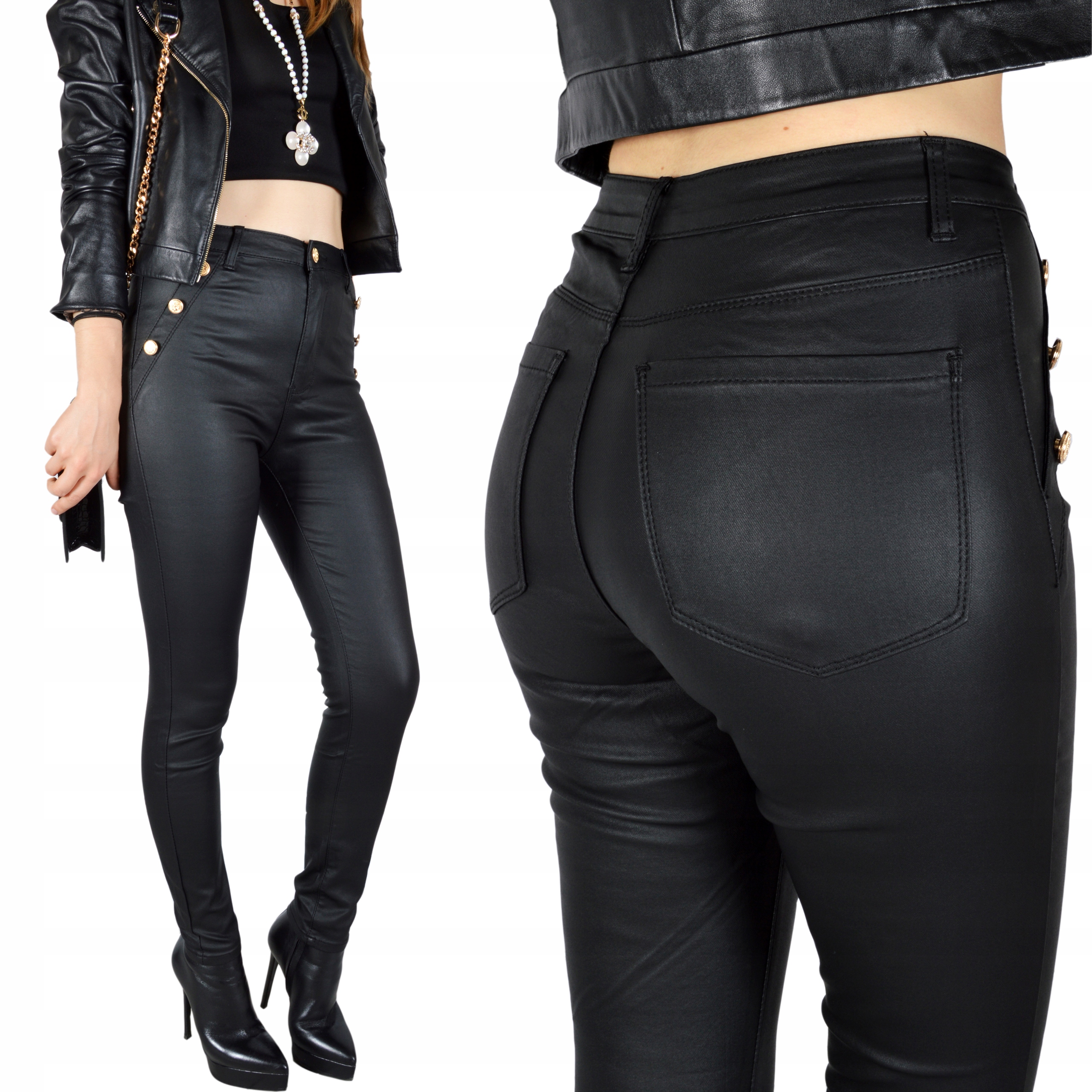 КРАСИВЫЕ ЖЕНСКИЕ БРЮКИ ИЗ ЭКО-КОЖИ С ДЕКОРАТИВНЫМИ ЗОЛОТЫМИ ПУГОВИЦАМИ