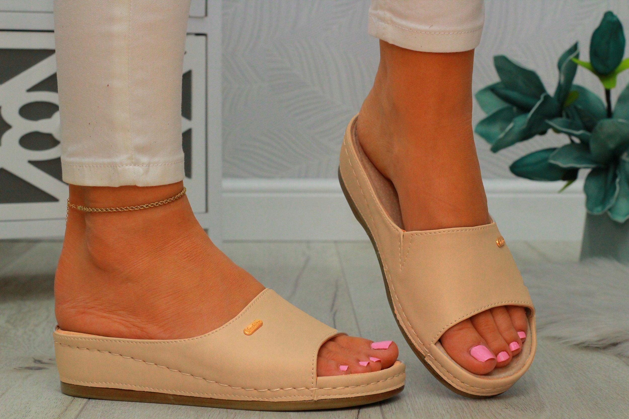 Женские тапочки HIT на нежной танкетке бежевого цвета, легкие и удобные.