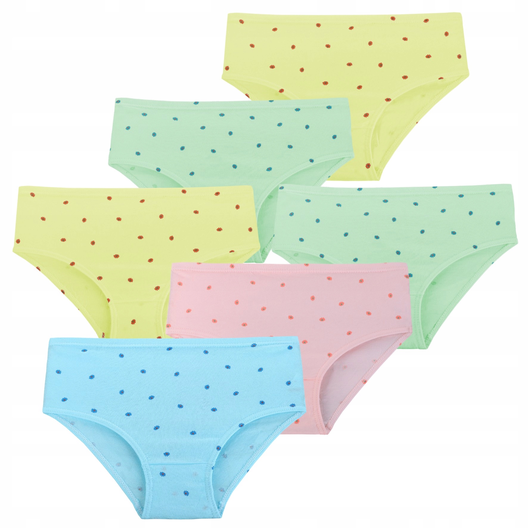 Данная модель трусиков доступна в наборе из 6 штук случайных цветов: белого, мятного, синего, желтого, розового и случайных рисунков.