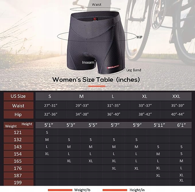 - 3D -подкладка: 3D подкладка толщиной 2,5 см от силиконового геля обеспечивает хорошую защиту, чтобы избежать повреждений во время велосипеда. С очень легким весом и дышащим материалом, чтобы уменьшить раздражение кожи и антибактериальные, чтобы защитить бедра и расположение