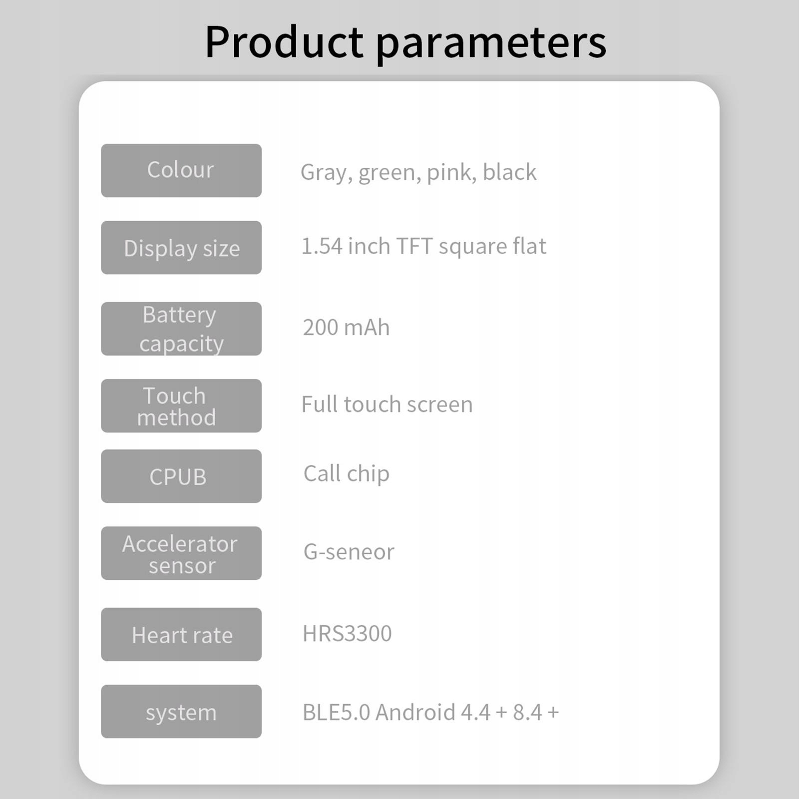 Цветной дисплей 1,54 дюйма, аккумулятор емкостью 200 мАч, поддержка напоминаний о звонках и сообщениях, поддержка секундомера.