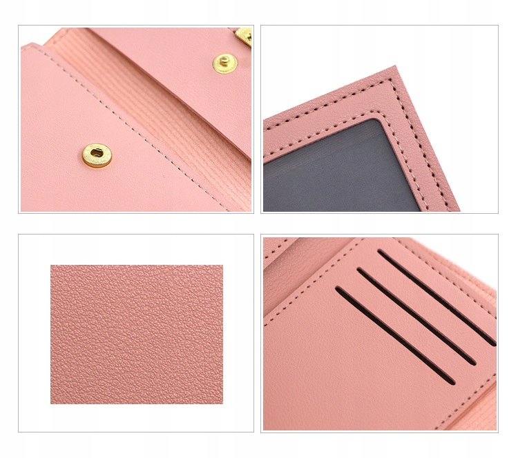 Женский кошелек с модной отделкой. Изготовлен из высококачественной экологической кожи. Он застегивается на защелку. Внутри 6 отделений для платежных карт или документов и одно отделение большего размера для купюр.