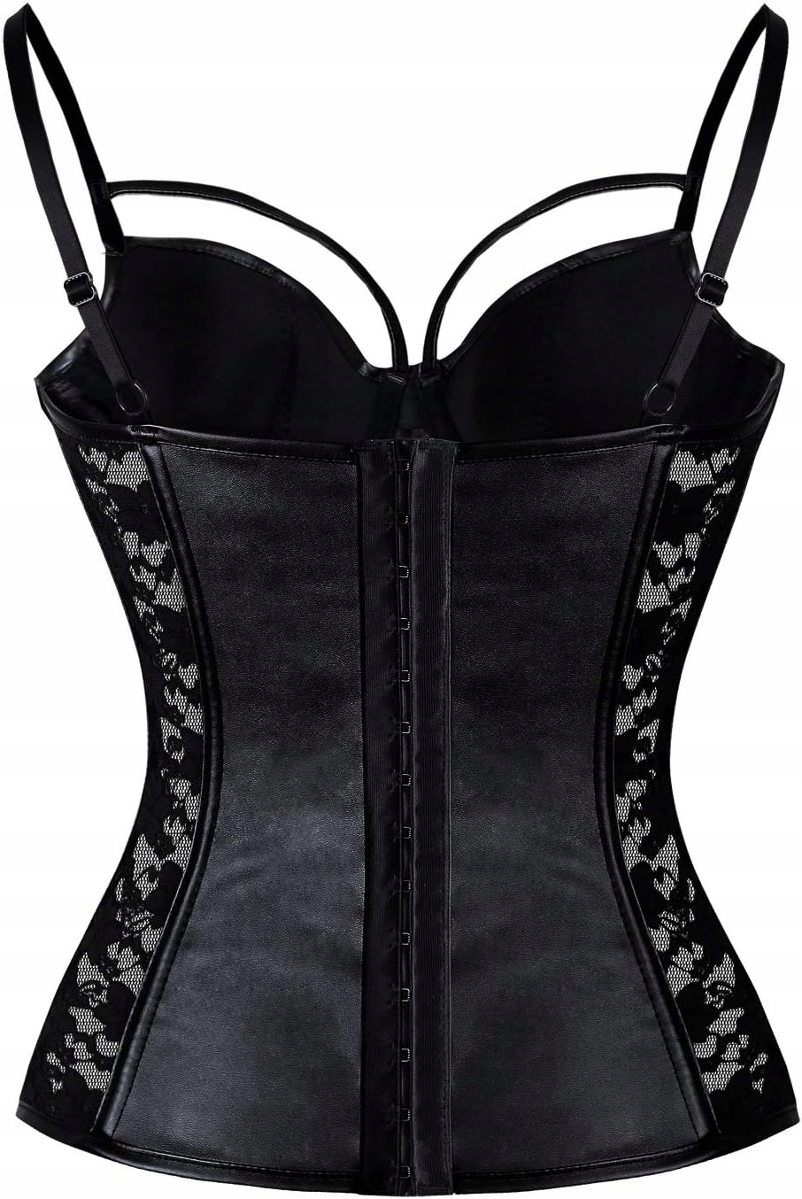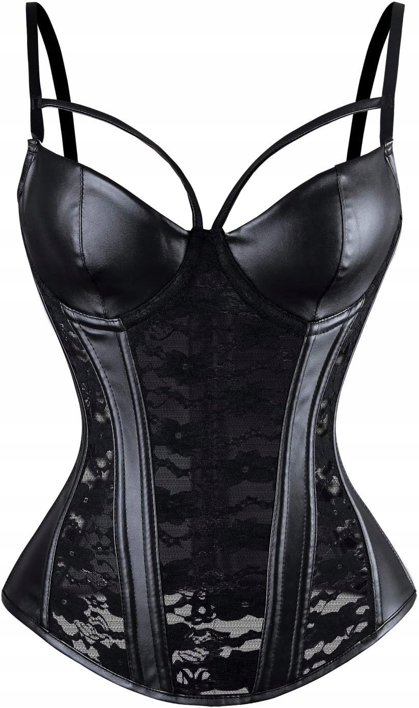 Женский черный панк -корсет с регулируемыми ремнями для спагетти, бюстгальтер с искусственной кожей с мягкой миской, как спереди, так и сзади с кружевным цветочным рисунком, 3 ряда креплений на липучке сзади.