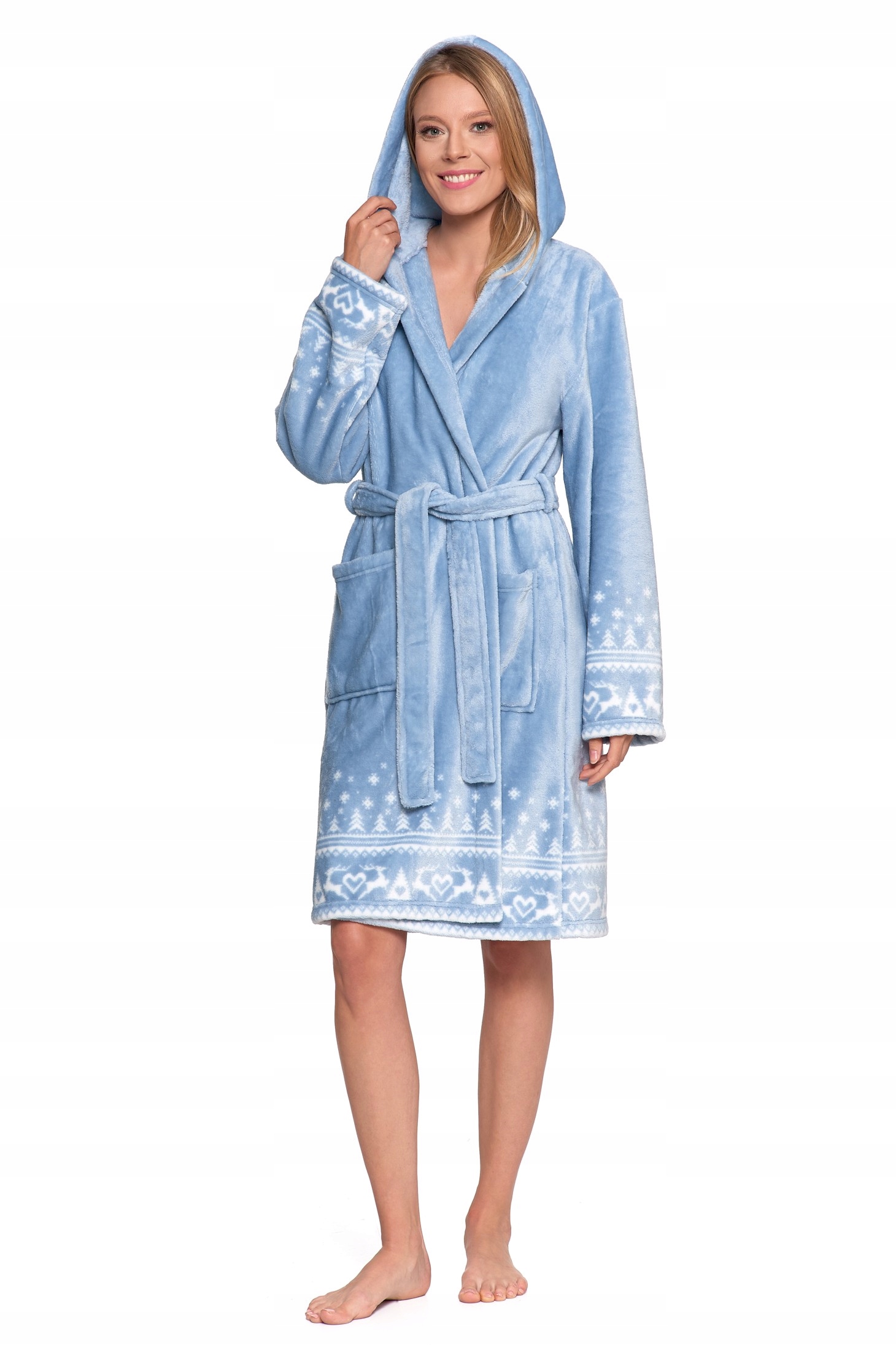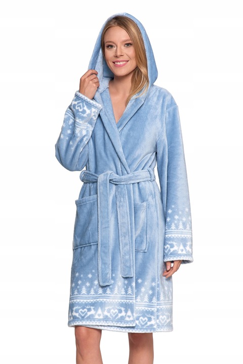 Откройте для себя зимний уют с нашим уникальным женским халатом с капюшоном. Изготовлен из чрезвычайно мягкого плюшевого материала, который нежно обволакивает тело и обеспечивает приятное тепло в холодные дни. Укороченный крой выше колена, практичный капюшон и очаровательный зимний узор делают эту модель сочетанием комфорта и стиля.