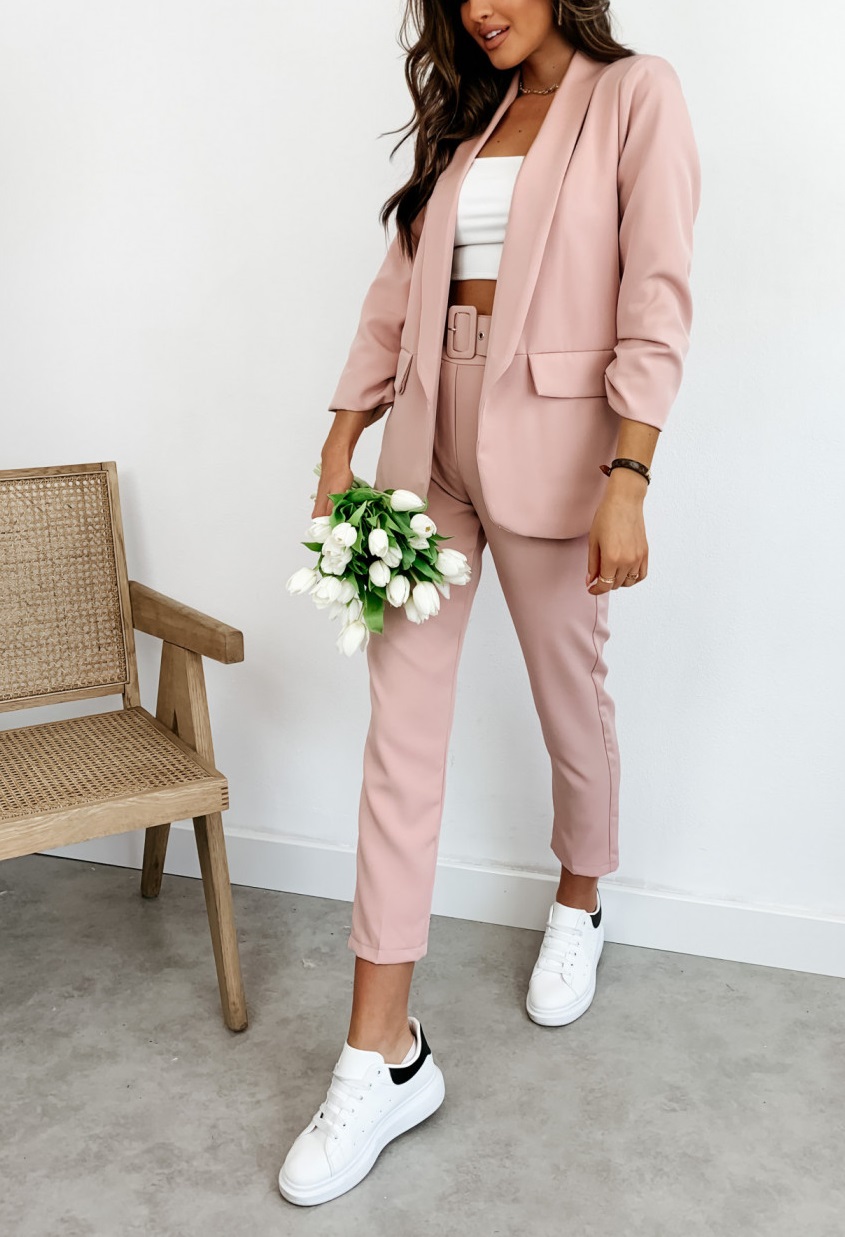 ЖІНОЧИЙ КОСТЮМ, КОМПЛЕКТ БЛЕЙЗЕР, БРЮКИ З ПОЯСОМ, ПУДРОВО-РОЖЕВИЙ, 40 Л