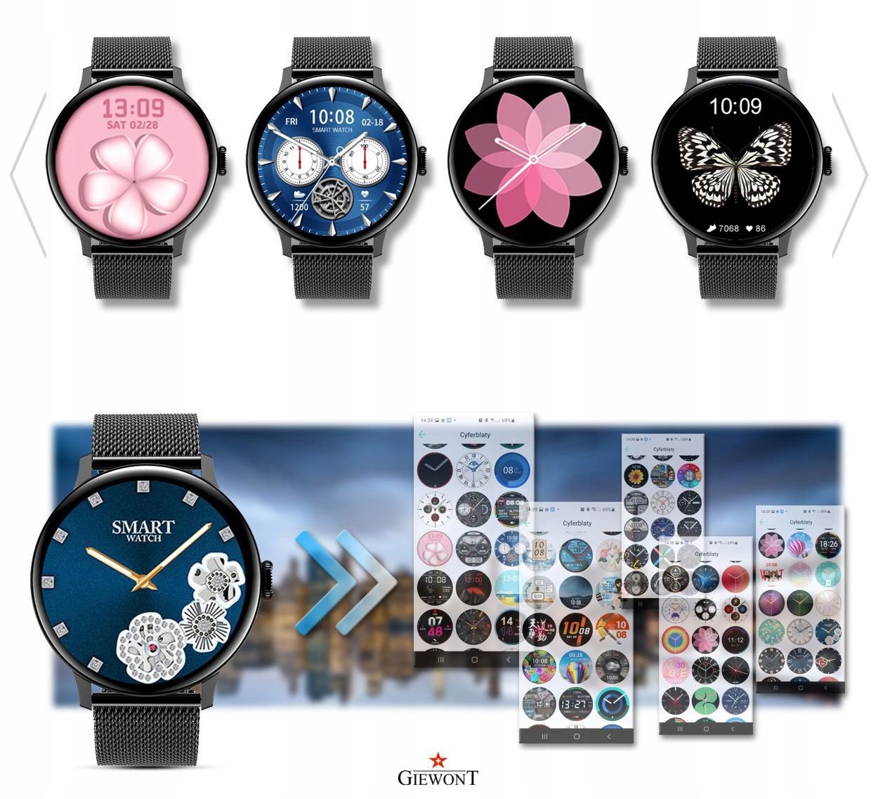 SmartwatchGiewont — технологичные женские электронные часы. Эта модель сочетает в себе функции, поддерживающие здоровый образ жизни, и элегантный внешний вид. Бренд прилагает все усилия, чтобы удовлетворить требования и потребности людей, ценящих функциональность и качество. Металлический круглый корпус идеально сочетается с силиконовым ремешком темных тонов. Благодаря дополнительному браслету из черной сетки эта модель будет не только отличным компаньоном во время тренировок, но и отлично смотрится как практичный повседневный аксессуар.