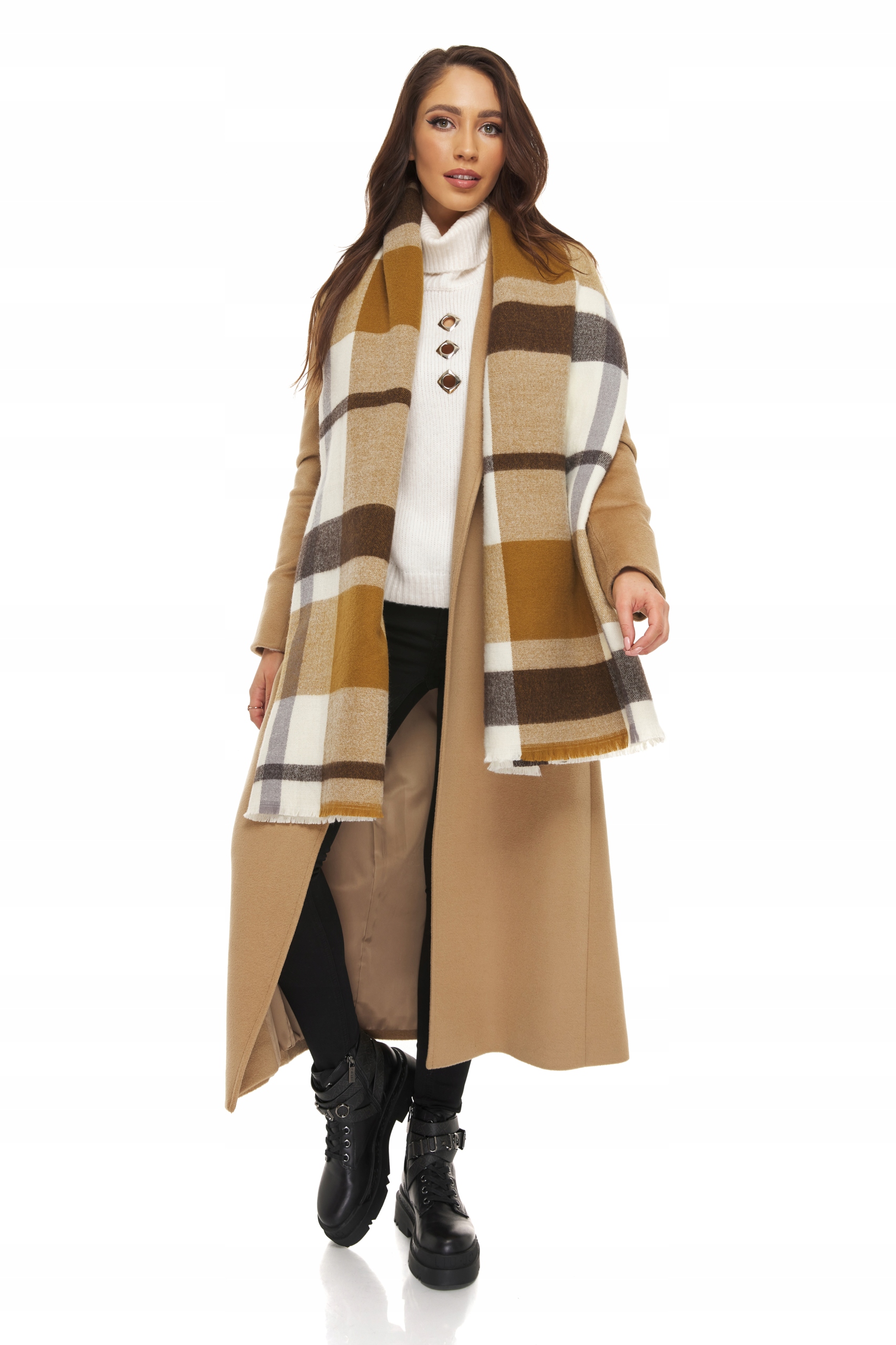 ЖІНОЧИЙ ШАРФ ВЕЛИКИЙ товстий картатий коричнево-бежевий екрю