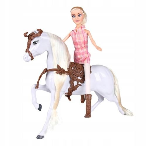 Установите куклу жокей с лошадью. Имеет длинные светлые волосы, которые можно расчесывать Включено: