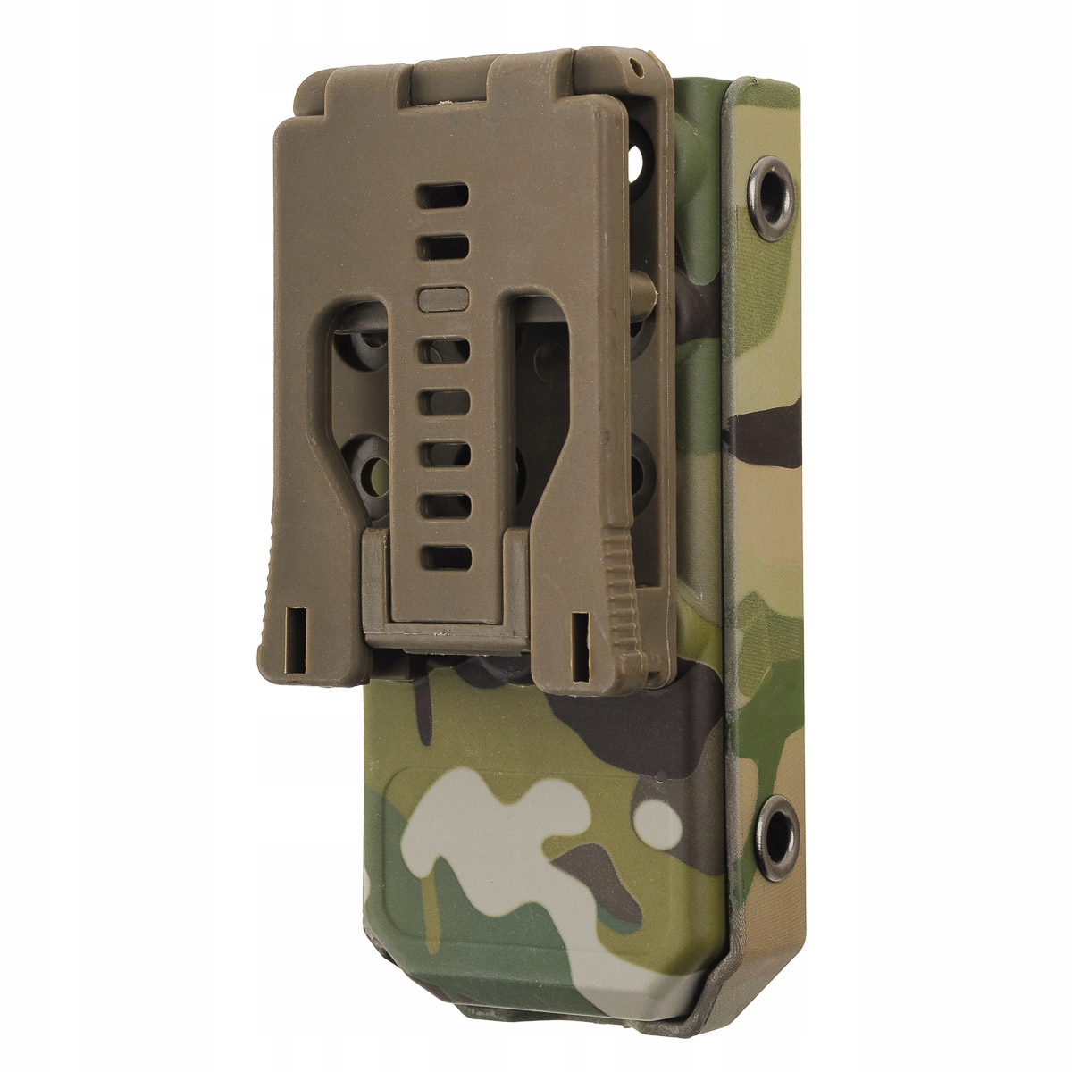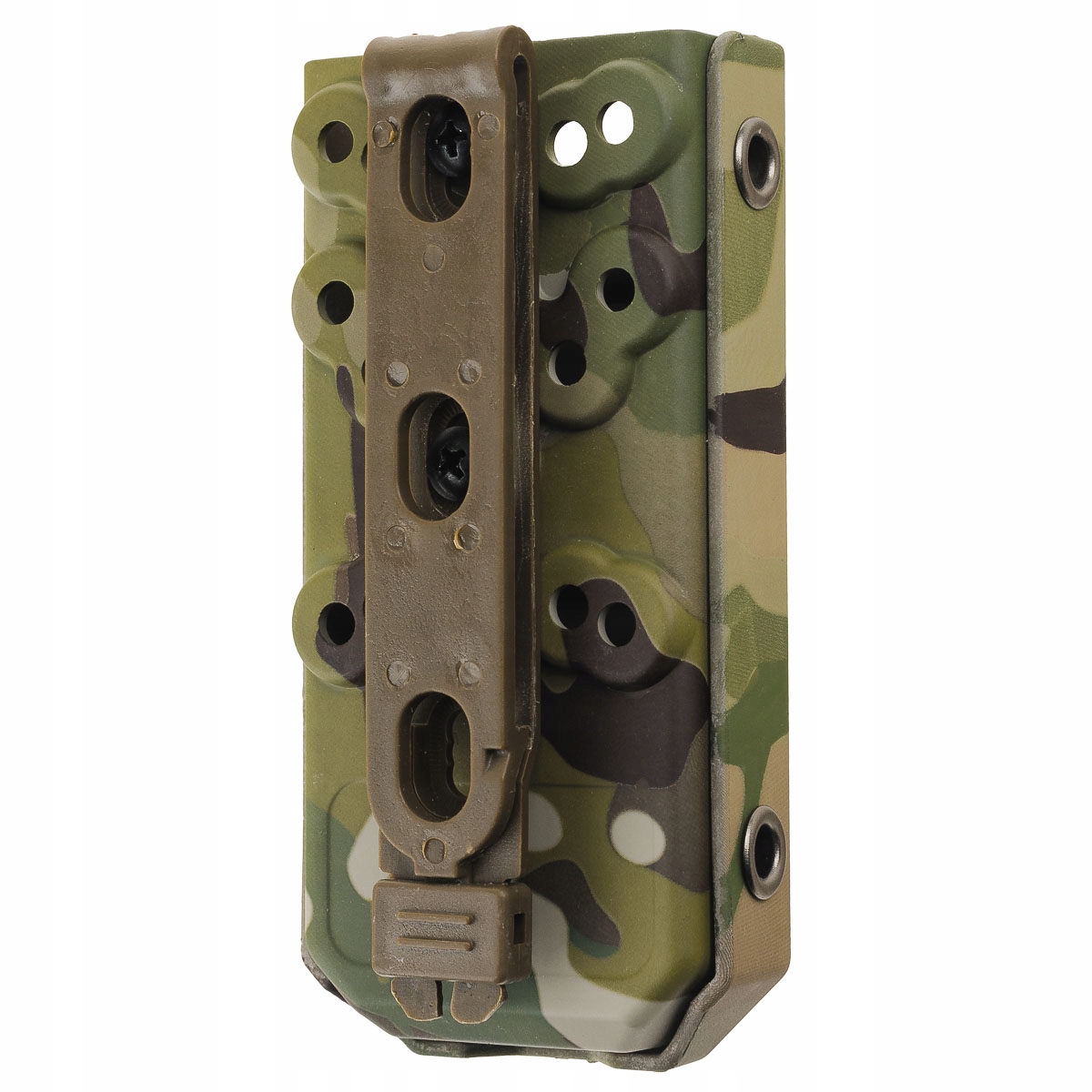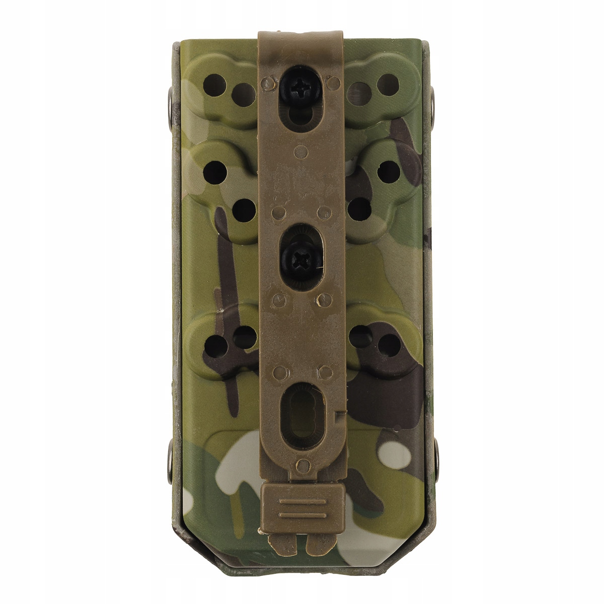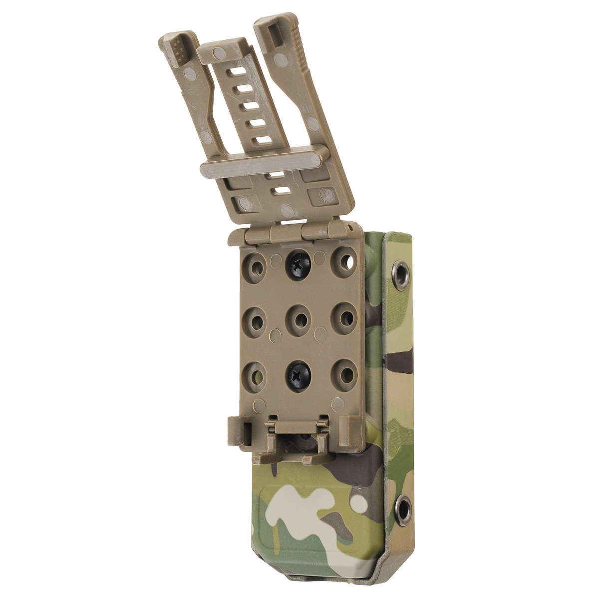 Чехол предназначен для ношения на модульной системе MOLLE/PALS и непосредственно на поясе. В комплект входит переходник MOLLE, позволяющий быстро установить модульную систему. Зажим заменяет вертикальную ленту, переплетенную петлями PALS. Легко вдевается и застегивается.