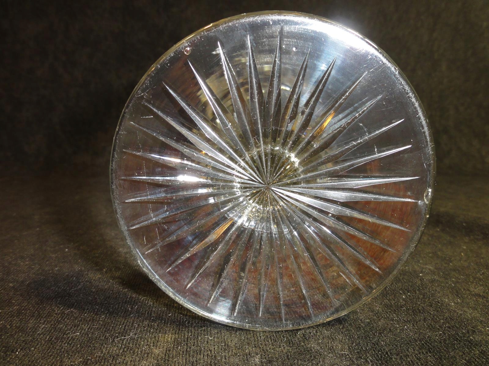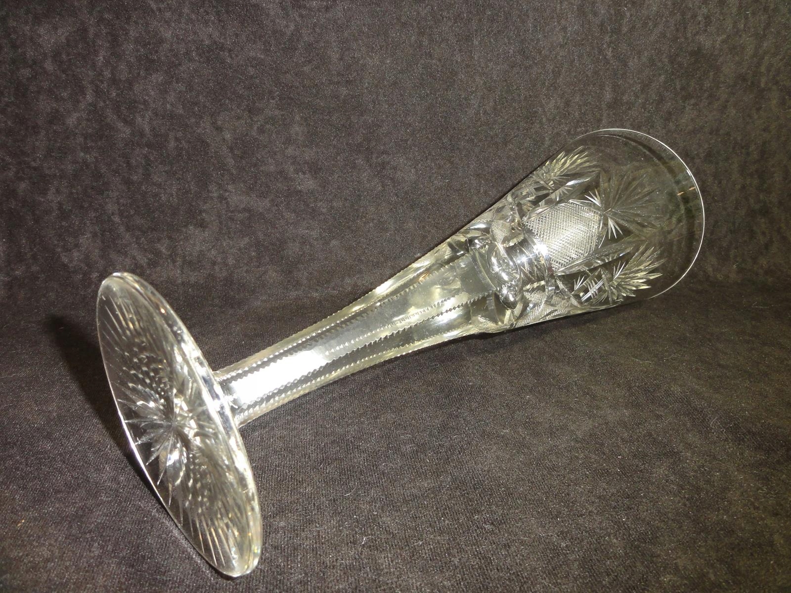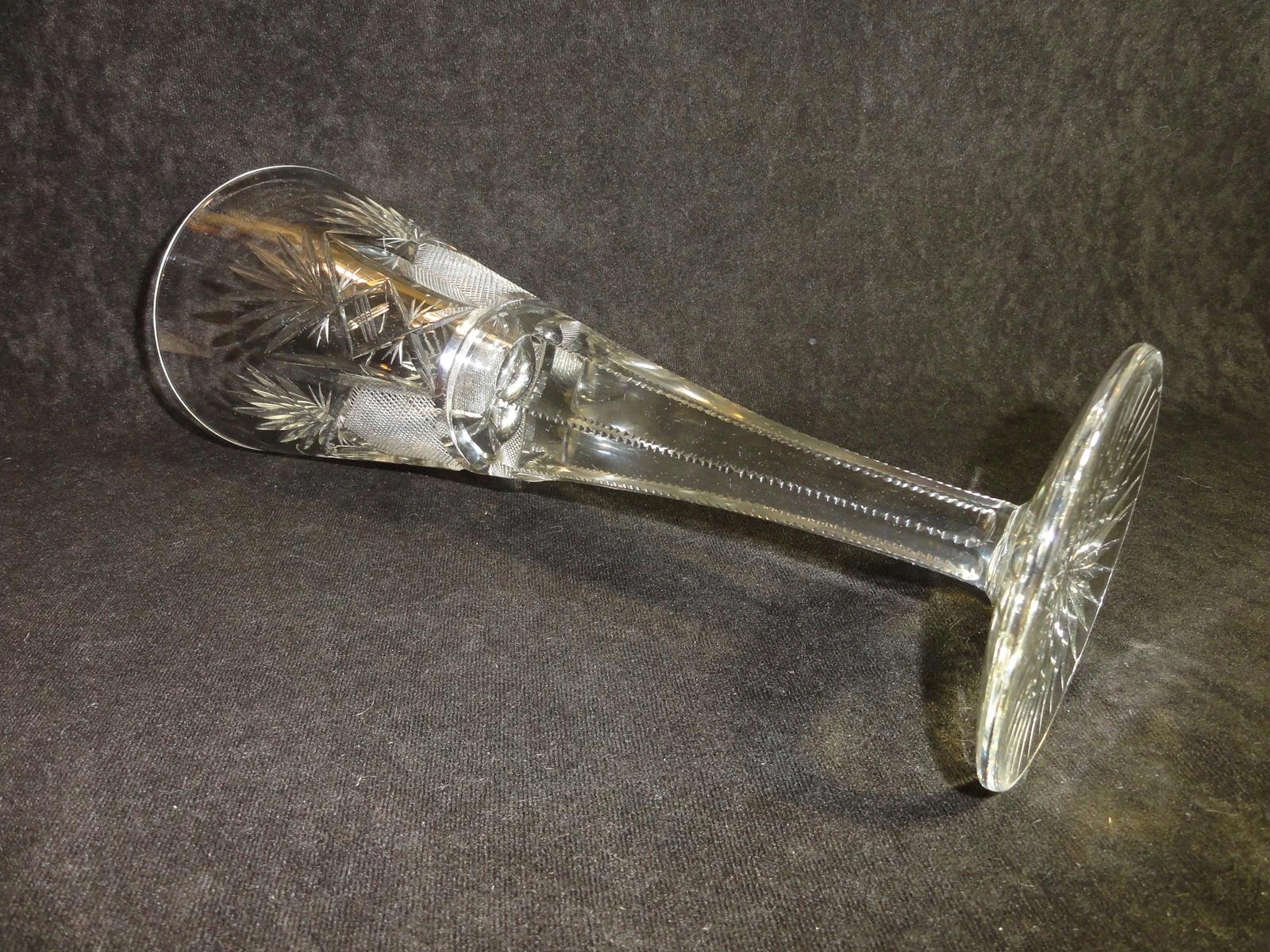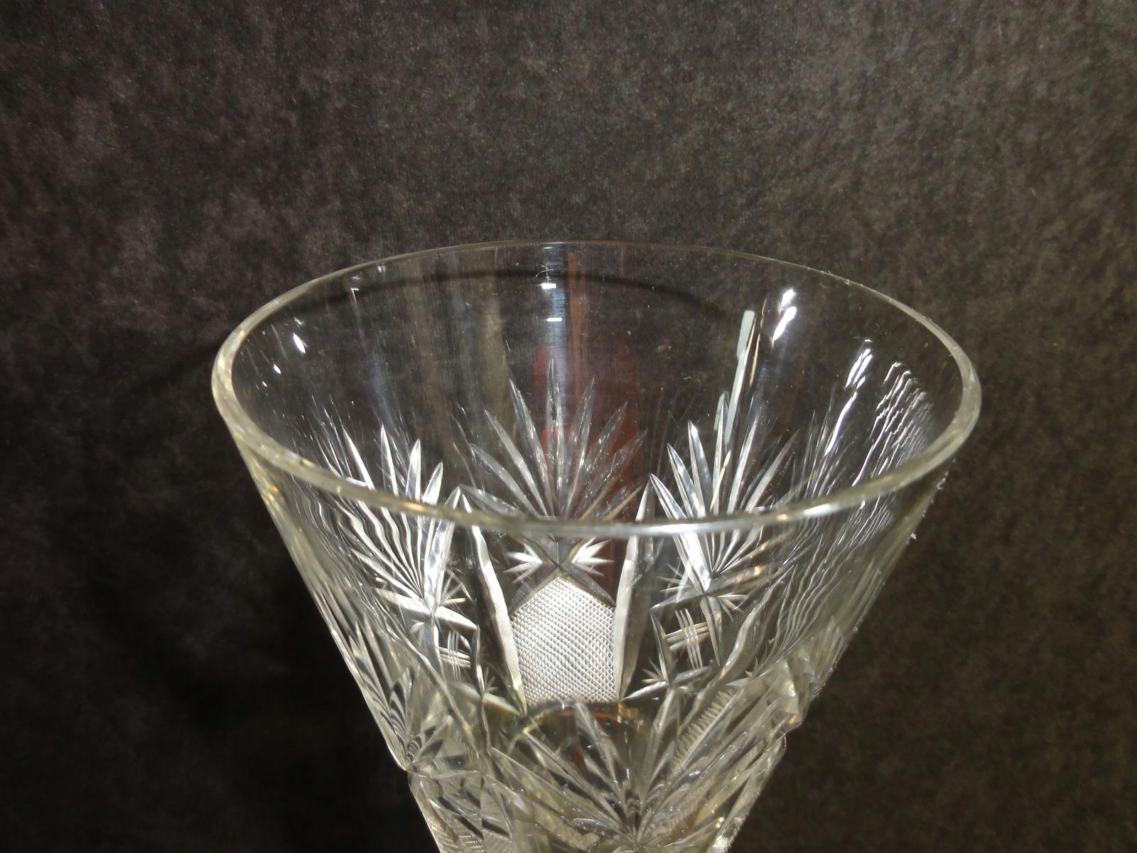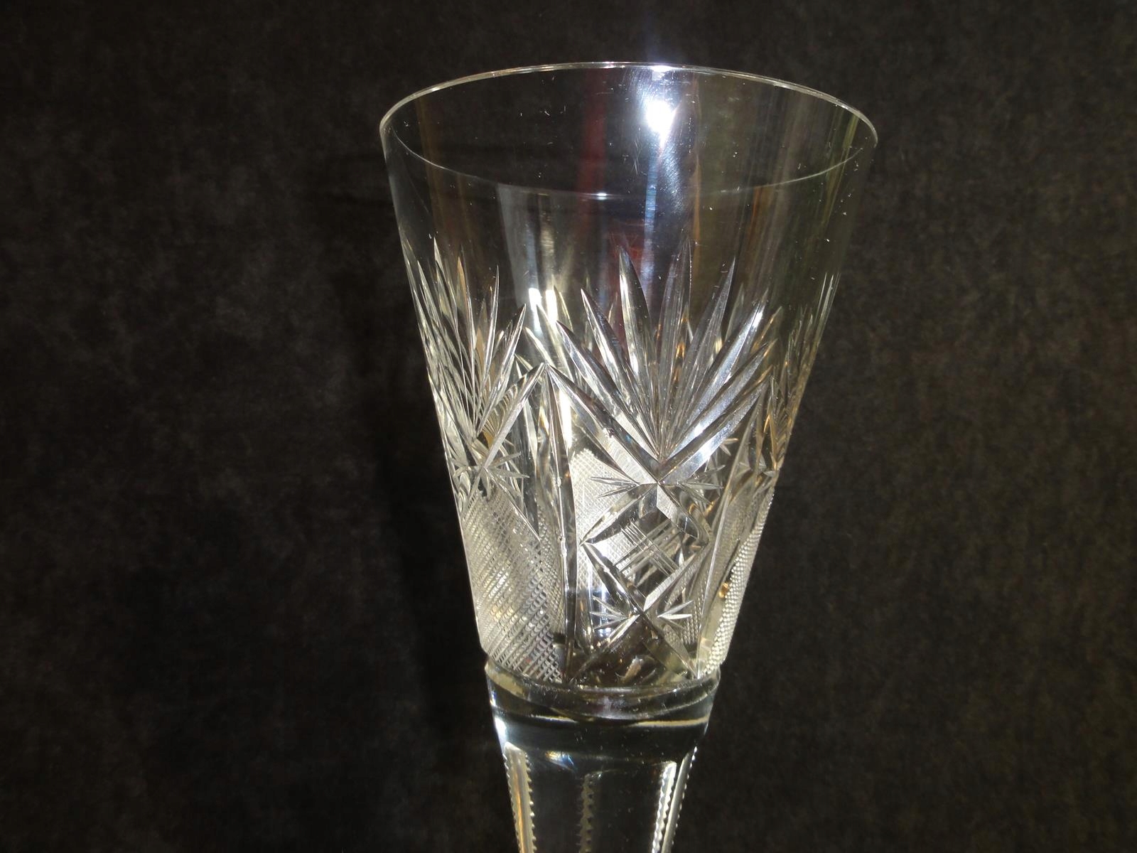 *чаша из бесцветного стекла, выдутая в форме, шлифованный стержень, чаша с 9 пузырьками воздуха у основания, точно отшлифованная на брюхе, ножке с розеткой,