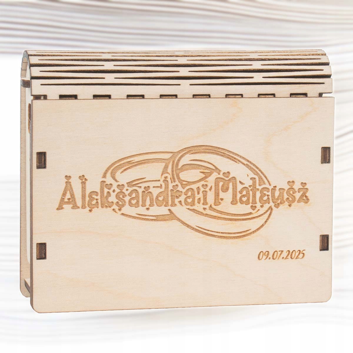 Гравировка на крышке - это просто предложение. Вы можете включить имена молодоженов и дату брака. Место по запросу. Гравировка сделана в лазерной технологии, благодаря которой она является постоянной и эстетической. p>