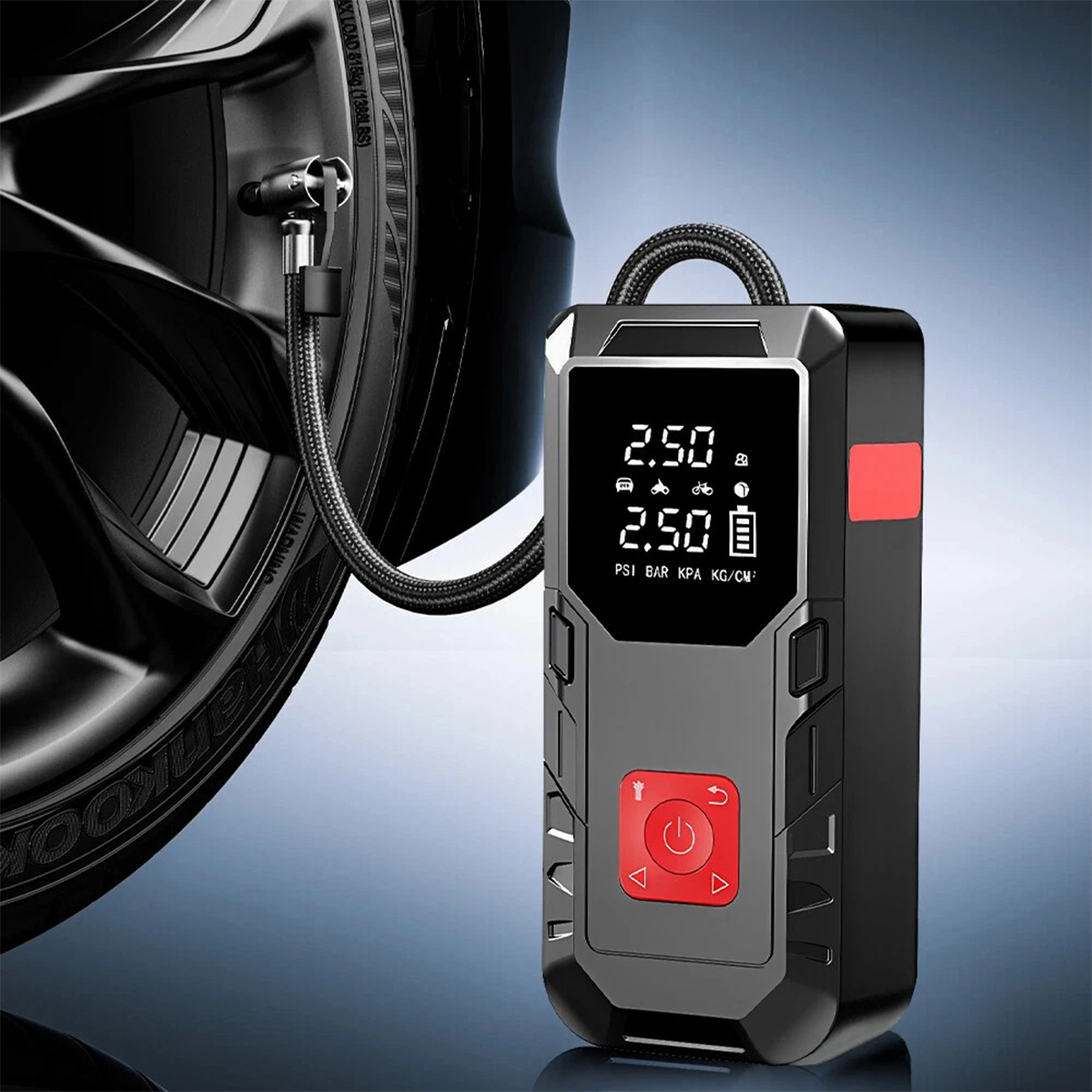 Оно оснащено 4 различными насадками, 4 дополнительными единицами измерения давления (PSI, BAR, KPA, кг/см²) и 4 предустановленными режимами надувания (велосипед, мотоцикл, автомобиль и мяч).