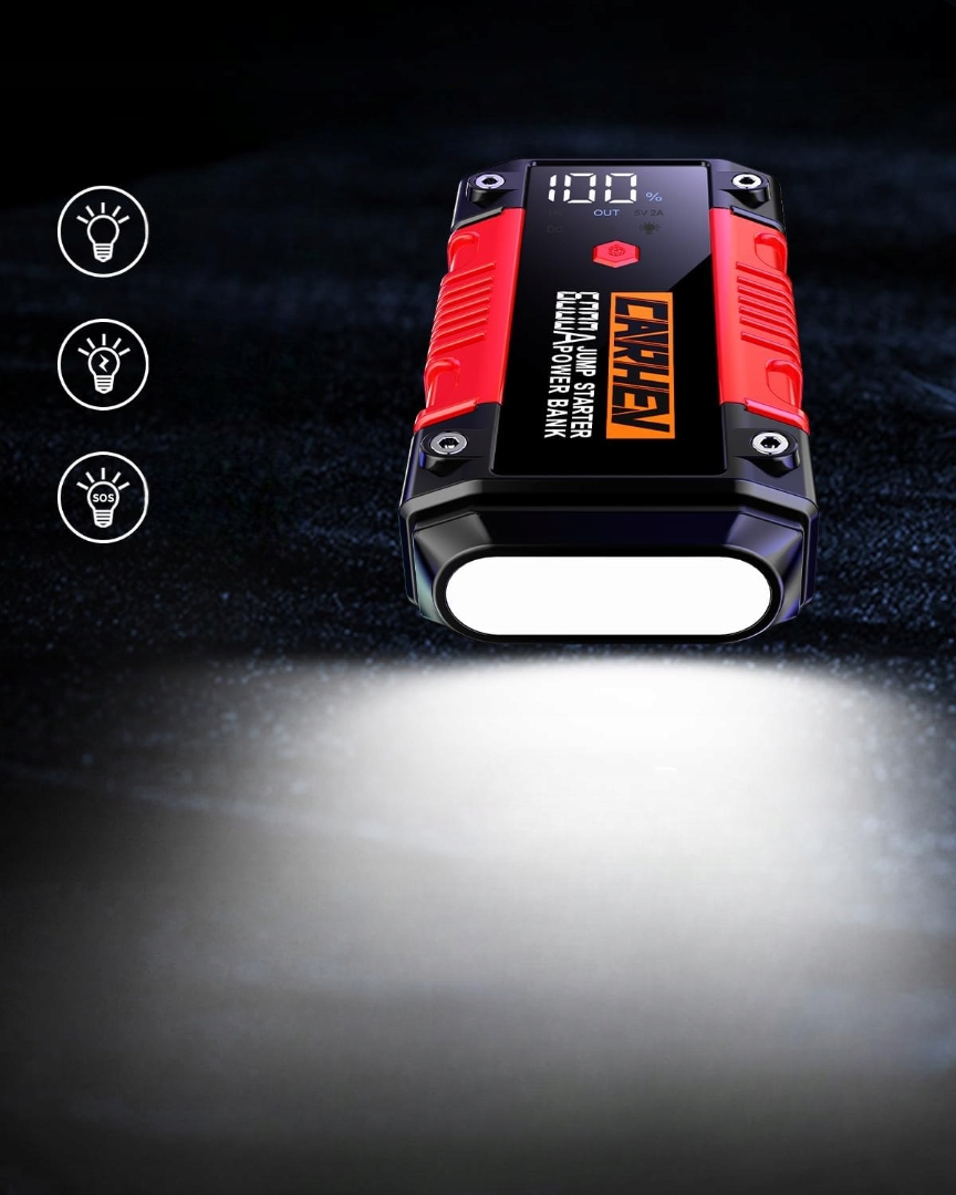 Портативный автомобильный стартер CARHEV оснащен цифровым ЖК-дисплеем, на котором отображается состояние аккумулятора. По сравнению с другими устройствами без ЖК-дисплея, оснащенными только индикаторами, теперь вы можете визуально проверить состояние батареи и оставшийся заряд. Материал корпуса со степенью защиты IP65 предотвращает повреждение внутренней конструкции от дождя, пыли и внешних факторов, адаптируясь к широкому спектру сложных условий эксплуатации.