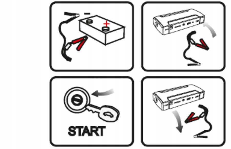 Устройство спроектировано таким образом, что каждый пользователь может управлять им. Чтобы завести автомобиль, просто соедините положительный и отрицательный провода кабель к положительной и отрицательной клемме аккумулятора. Затем подключите другой конец соединительного кабеля ко входу устройства. Поверните ключ в зажигании автомобиля. После запуска автомобиля снимите клеммы аккумулятора.