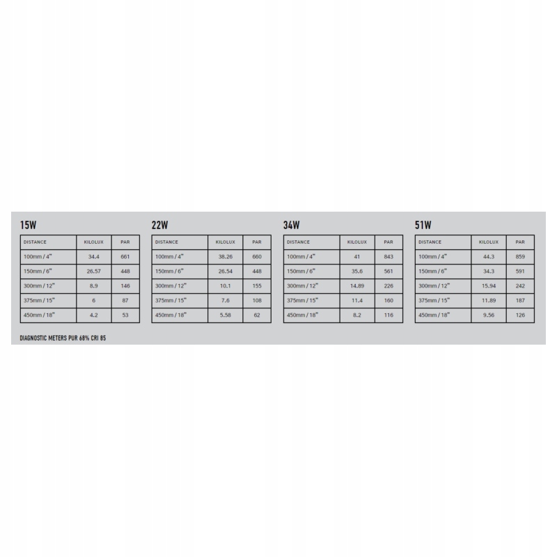 - Высокие параметры PAR (см. таблицу высоты подвеса и мощности), PUR 62% (полезный свет для фотосинтеза), CRI 85 (цветопередача)