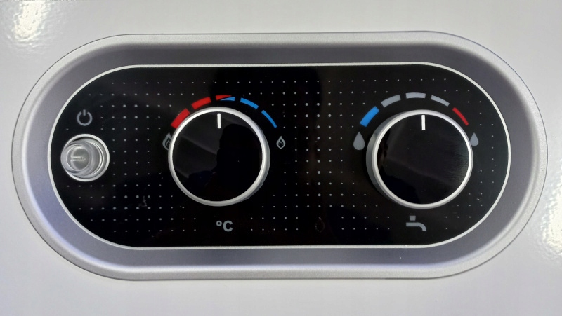 Современная панель управления, оснащенная двумя симметрично расположенными ручками, позволяет легко регулировать параметры работы устройства. Мощность горелки регулируется ручкой слева, а расход – ручкой справа. После первичной настройки устройство само регулирует мощность горелки для получения постоянной температуры воды независимо от изменения расхода воды.