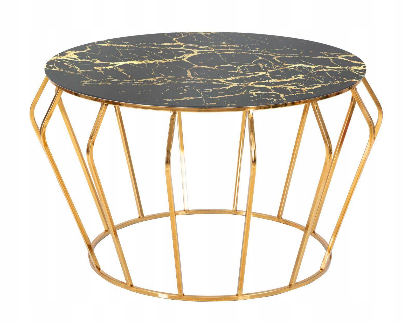 Круглый журнальный столик из золотистого металла со стеклянной столешницей с обработкой под мрамор. Линейный узор и контраст золота и черного создают элегантный и исключительно классический эффект.