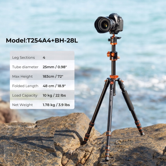 T254A4 - отличный выбор для любителей фотографии, которые заботятся о универсальности и удобном транспорте. Алюминиевый дизайн весит 1,86 кг, а после складывания он составляет 49 см. Благодаря этому вы можете легко прикрепить его к своему рюкзаку и распространить его через несколько секунд, где бы ни была возможность сделать уникальные фотографии на горизонте.
