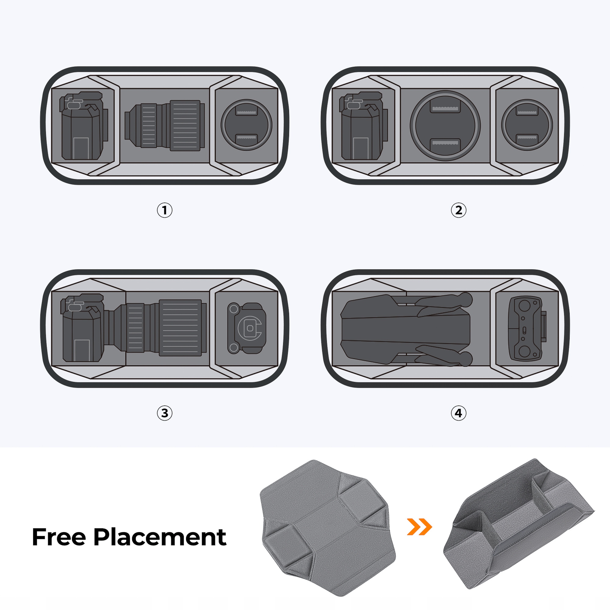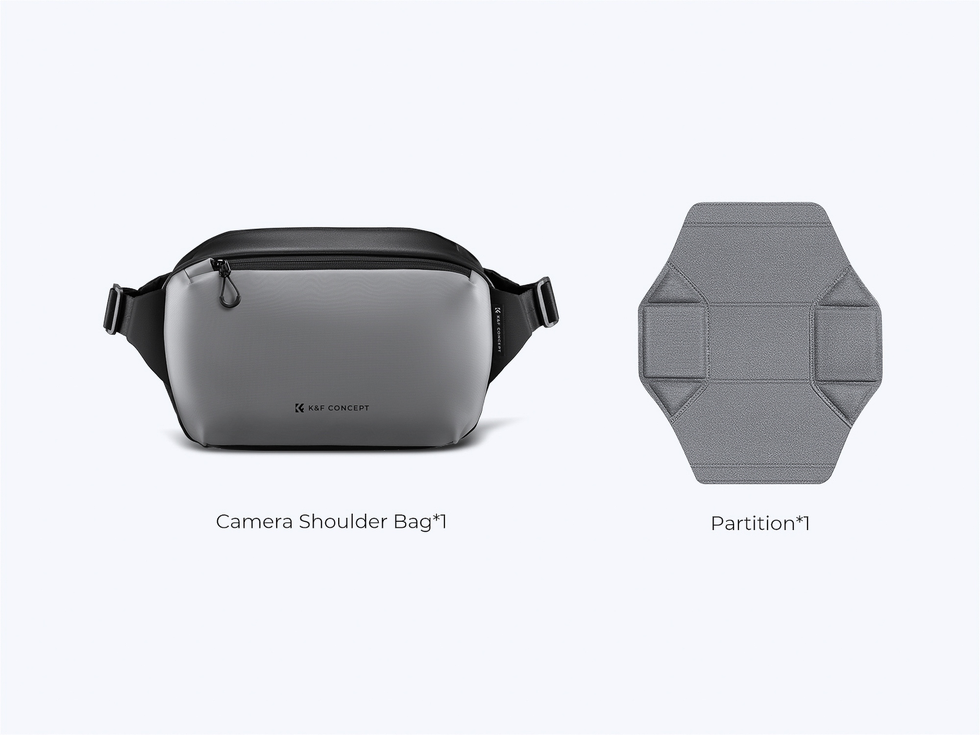 Фотосумка K&F Concept Alpha Sling Bag объемом 10 л имеет съемное отделение. Аксессуар из твердых материалов облегчит организацию пространства. С ее помощью вы сможете разделить внутреннюю часть сумки на 2 или 3 части, в зависимости от имеющегося у вас с собой снаряжения. Отделение также дополнительно укрепляет сумку и обеспечивает еще лучшую защиту переносимых устройств. Вот пример того, что может вместить слинг-сумка K&F Concept Alpha объемом 10 л: