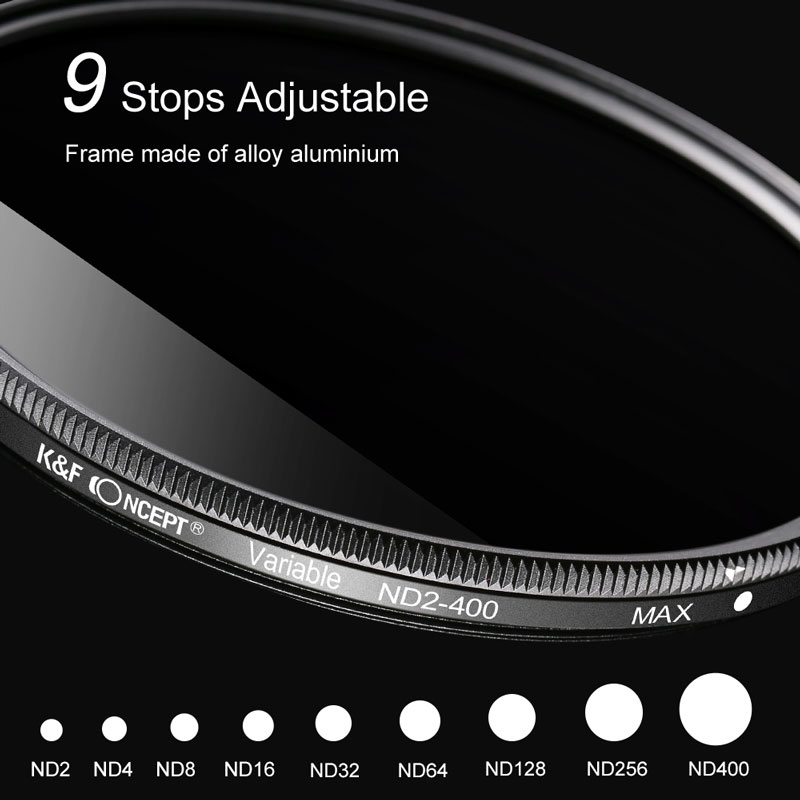 Регулируемая K & F Фильтр Slim Variable ND2-ND400 72 мм серого-это базовая модель, которая уменьшает количество света в диапазоне от ND2 до ND400, которая соответствует апертуре от 1 до 9 градусов. Изготовленный из высококачественного оптического стекла, имеет твердую и тонкую алюминиевую раму, которая устраняет провисание, предотвращает виньетирование и защищает от блокировки фильтра.