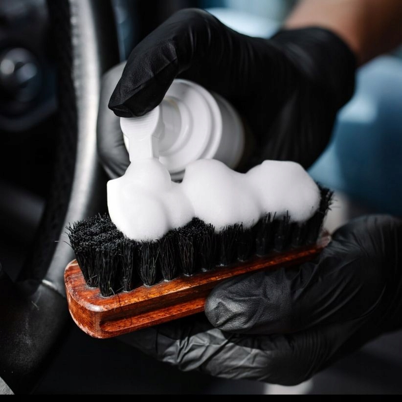 Нанесите пену на кисть и очистите поверхность круговыми движениями. После нанесения средства промойте кисть под проточной водой и дайте ей высохнуть самостоятельно.