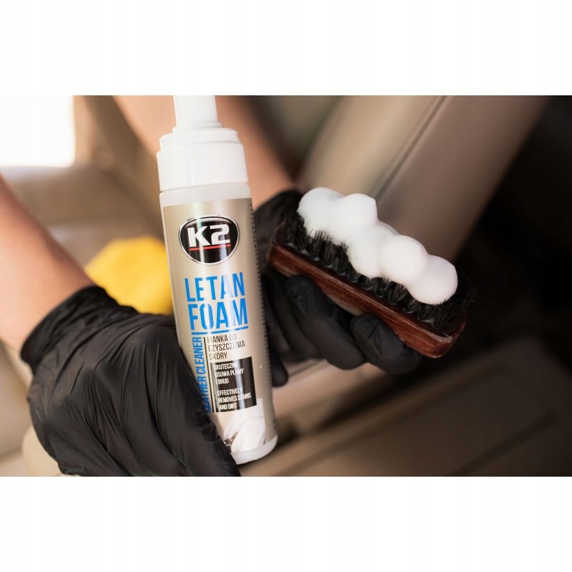 K2 LETAN FOAM – высокоэффективное средство для чистки кожаной обивки салона автомобиля. Предлагается в виде активной пены, которая при использовании щеткой обеспечивает высокую очищающую способность. Он идеально подходит для старой обивки, в том числе очень грязной. Легко удаляет все загрязнения, в том числе застарелые и стойкие пятна.