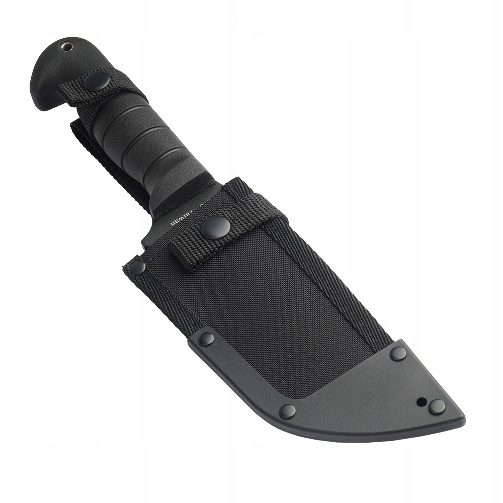 Лезвие с хвостовиком изготовлено из цельного куска углеродистой стали 1085, покрыто черным напылением для защиты от отражений и коррозии. Ручка изготовлена из термопластика Kraton G, поэтому идеально лежит даже в мокрой или грязной руке. В комплект входят ножны из кордуры с полимерным наконечником и металлическими кнопками, которые можно прикрепить к ремню шириной до 120 мм.