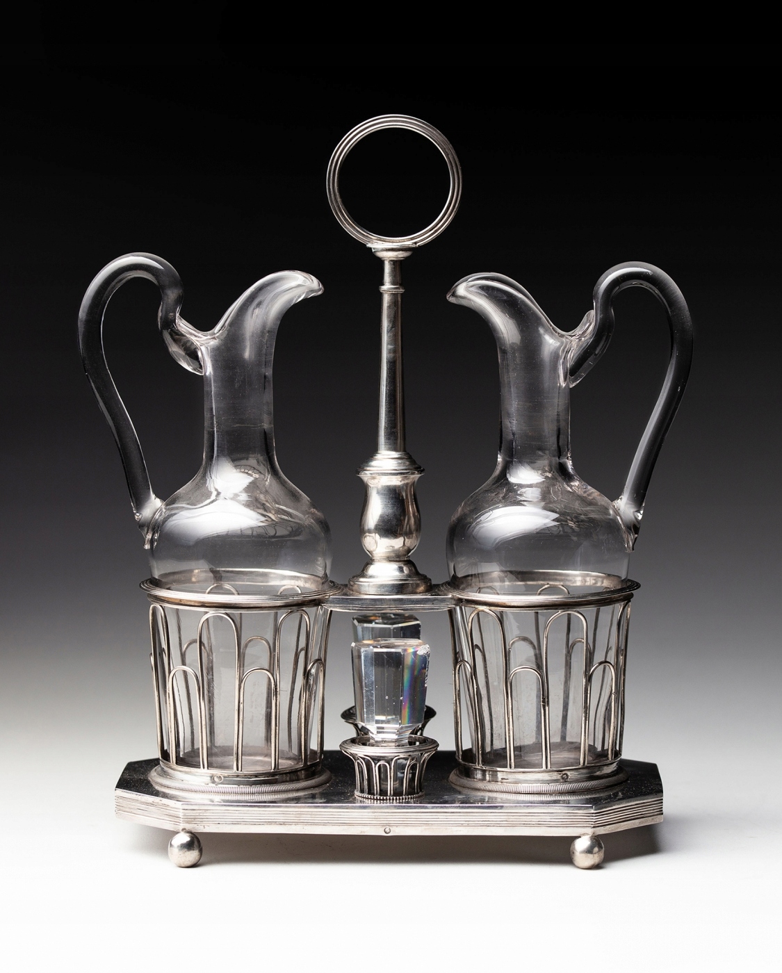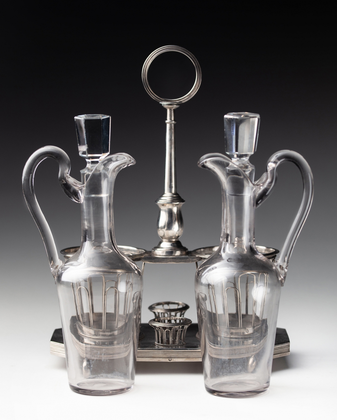 Кабаре для уксуса и оливкового масла, серебро 950 пробы, со стеклянными вставками, начало XIX века. Опирается на четыре шара с прямоугольным основанием, окруженным профилированным поясом, с размещенными на нем двумя ажурными корзинами из фигурных проволок, образующими аркады разной высоты, заключенными сверху профилированным венчиком; на более короткой оси два пробковых держателя в виде ажурных чашек. В середине, соединенный с обручами корзин, древко имеет профилированное основание с узлом и заканчивается ручкой в виде обруча. Обе бутылки изготовлены из свинцового стекла.