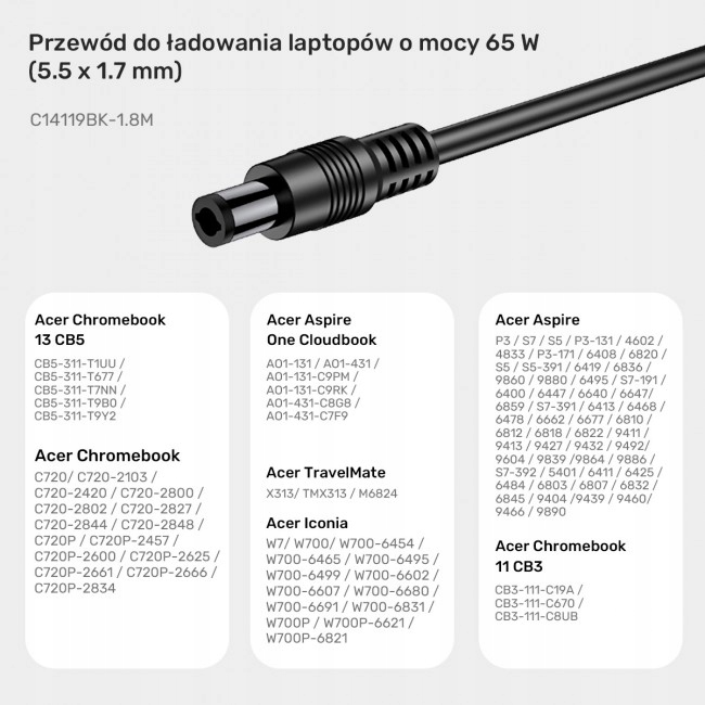 - Название продукта: Кабель питания Unitek для ноутбука Acer 65 Вт USB-C — DC5.5