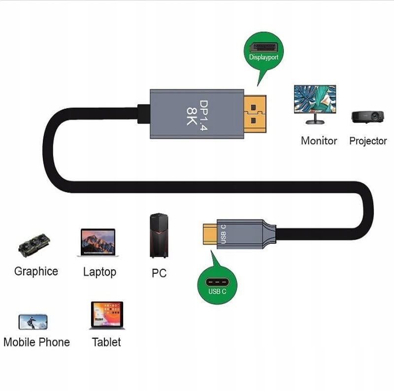Кабель USB C — DP 8K — это продукт, который позволяет подключать устройства с портом USB C к дисплею, поддерживающему разрешение 8K, с помощью разъема DisplayPort (DP). Это усовершенствованное кабельное соединение, позволяющее передавать видеосигнал высочайшего качества.