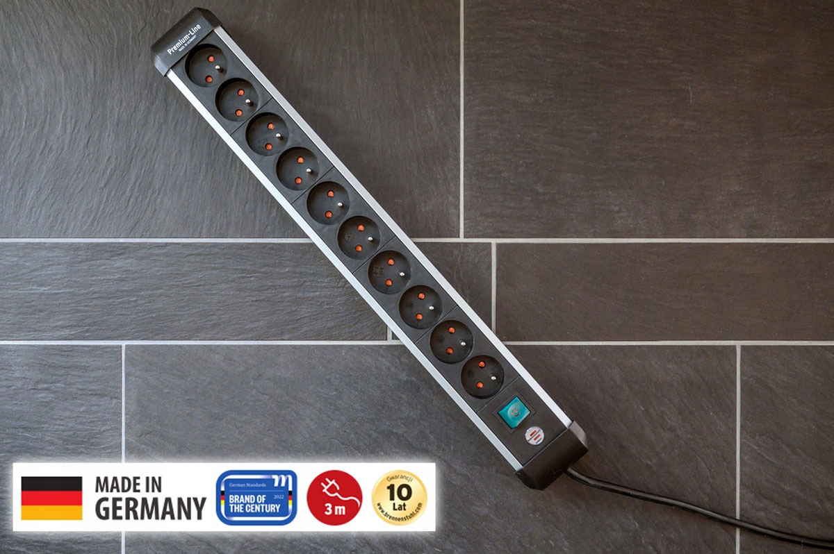 Удлинитель Premium-Alu-Line с 10 розетками в тонком корпусе служит оптимальным источником питания в домашнем офисе или на рабочем месте. Удлинитель с защитным выключателем с подсветкой (двухполюсный) и компактными розетками, расположенными под углом 45°, благодаря инновационной концепции монтажа можно закрепить на стене или даже на ножке стола. Многоконтактная розетка с повышенной защитой от прикосновения.