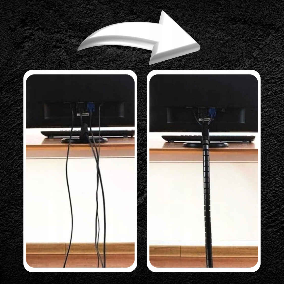 Вместо того, чтобы организовать кабели под мебелью, просто положите их в гибкую трубку. Больше не запутано в проводе - у вас есть один компактный кабельный ремень