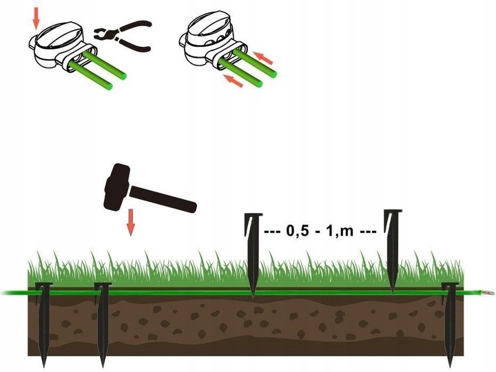 Кабель, прикрепленный к земле штырями, примерно через месяц зарастает травой и становится невидимым.