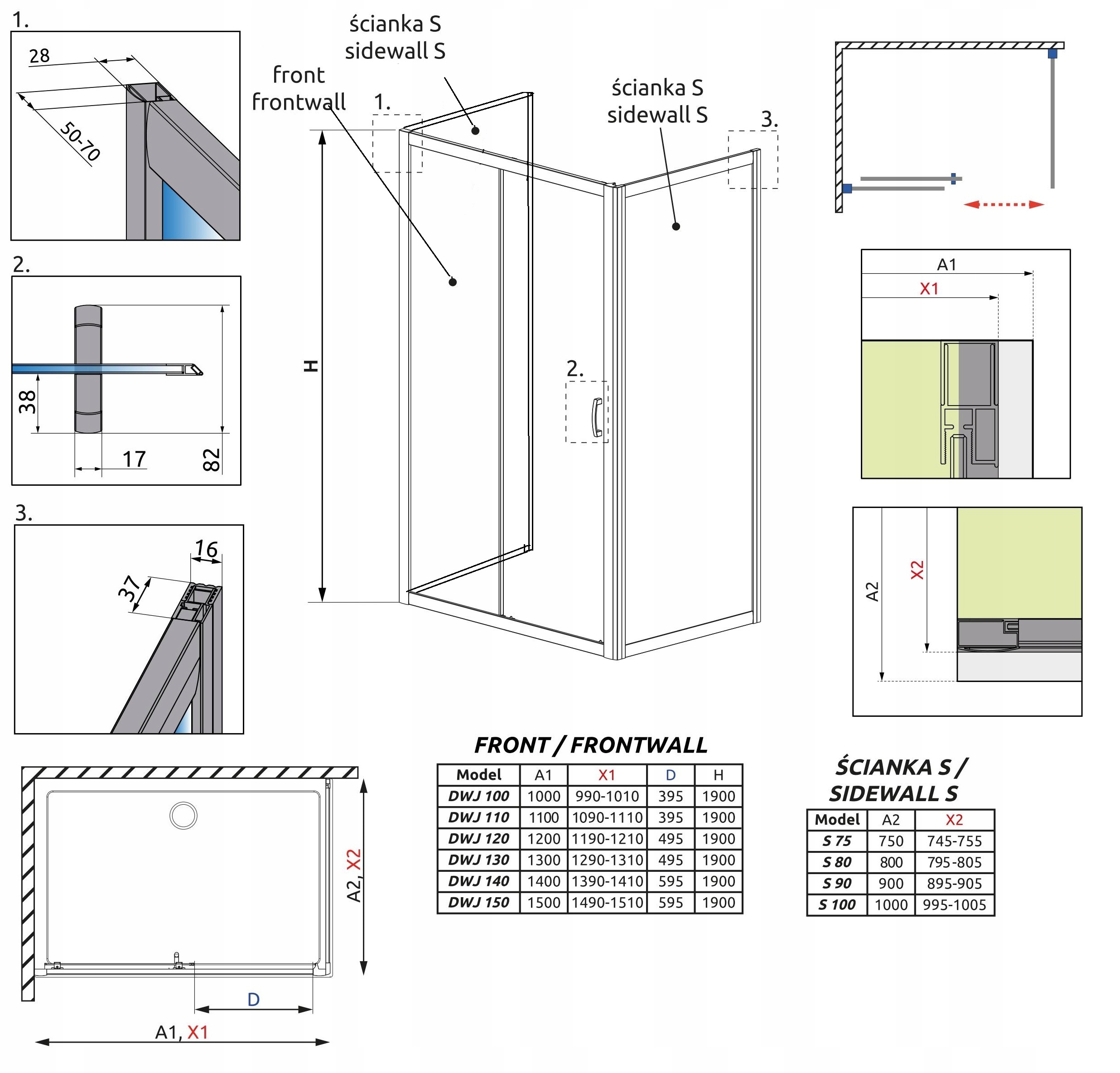 - Стекло безопасное закаленное, толщина 5/6 мм (неподвижные части 5 мм, подвижные части 6 мм)
