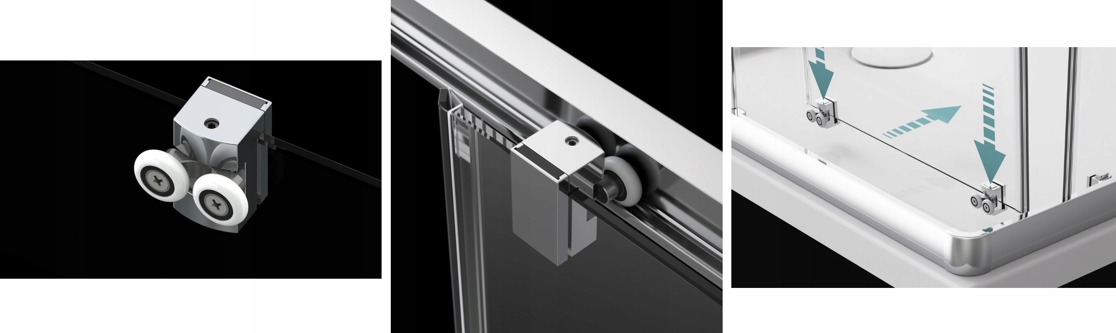 На фото внизу слева показаны поворотные ролики на шарикоподшипниках в хромированном корпусе. Посередине безопасное стекло толщиной 5 мм. С правой стороны есть возможность отстегнуть и наклонить дверь для очистки кабины.