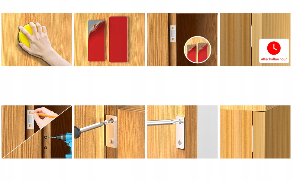 Сильный клей: Двусторонняя клейкая лента достаточно прочна, чтобы закрыть шкаф без сверления отверстий для винтов для его крепления. (Примечание: входящий в комплект клей доступен в красном и белом цветах и будет доставлен случайным образом.) Сэкономьте время и защитите свой дорогой шкаф от повреждений. Также предоставьте винты для установки. Пожалуйста, закройте и откройте дверь через 12 ЧАСОВ, чтобы клей хорошо приклеился к этой поверхности.