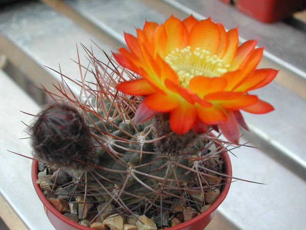 из Аргентины кактуса акантокалициума aurantiacum волшебен благодаря апельсиново-желтым угасным цветам, достигающим диаметра примерно 5 CM. Тело широкое сферическое, высота кактуса составляет около 5 см, а ширина может составлять до 9 см. Растение имеет серо-зеленый цвет, 10-16 ребра, один средний стебель и 5-7 краев с черным наконечником, который может достигать 5 см в длину.