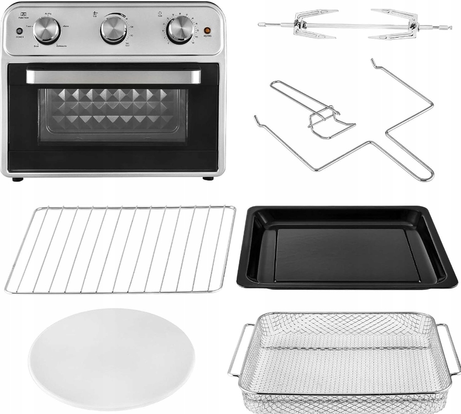 Набор включает в себя широкий выбор аксессуаров, в том числе камень для пиццы, противень, корзину для жарки, меш -решетку, барабанную барабанную барабанную плату и ротарию, что делает устройство универсальной опорой на кухне.