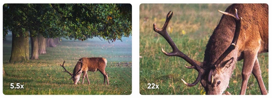 Вместо постоянного увеличения оптического бинокля увеличение 5,5x-22x с фокусным расстоянием 60 мм означает, что вы можете свободно увеличивать и уменьшать масштаб изображения. HABROK 4K от захвата всего окружения до распознавания мельчайших деталей, таких как оленьи рога или половые признаки, на расстоянии 150 метров в течение дня.
