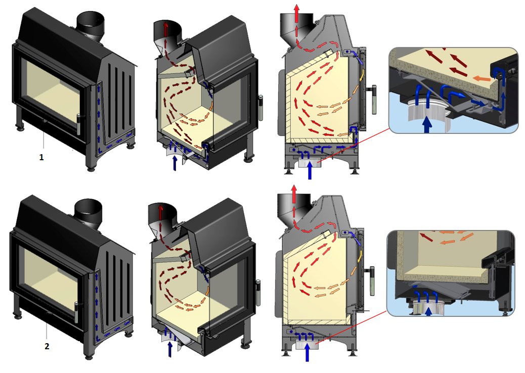 Кожух должен обеспечивать доступ воздуха, необходимого для вентиляции и циркуляции воздуха в кожухе, путем использования каминных решеток, подобранных по мощности топки (в нижней части кожуха - под топкой) и вытяжной решетки ( вверху кожуха - над вставкой).