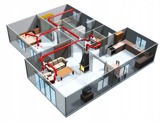 Приточная установка BANAN подготавливает и распределяет теплый воздух (максимум до 180°C) от вытяжки над каминным очагом в жилые помещения.