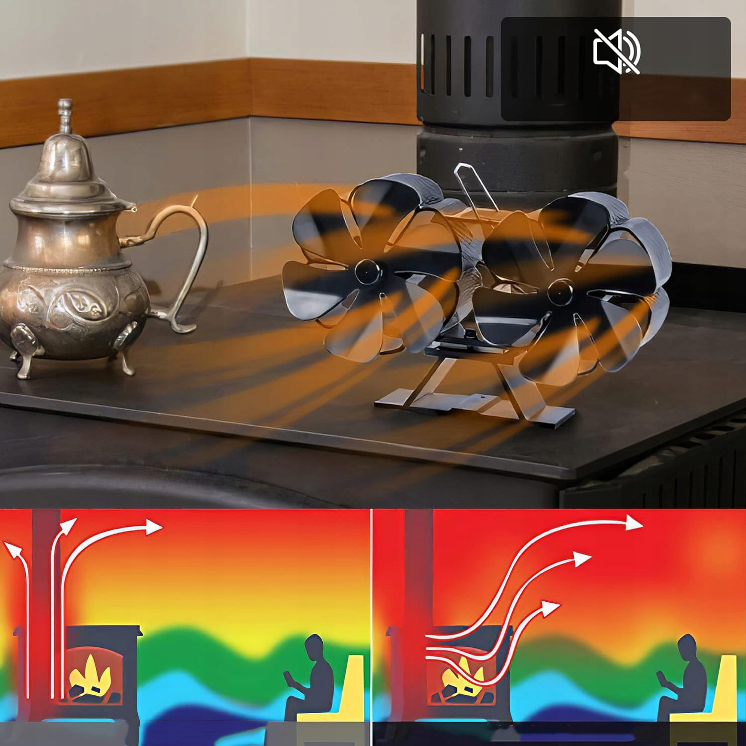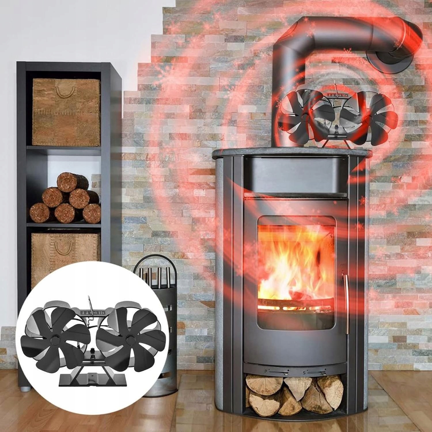 Вентилятор для дровяной печи имеет 12 лопастей и два двигателя, которые равномерно распределяют горячий воздух по во всем помещении и поддерживать тепло.