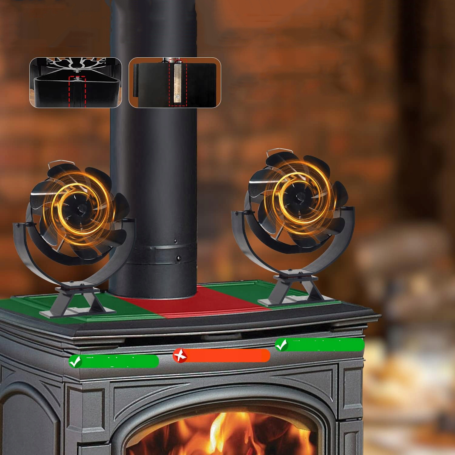 💨 - Установка не требуется, просто поместите вентилятор дровяной печи на гладкую, плоскую поверхность печи, рядом с боковой или задняя часть канала духовки.