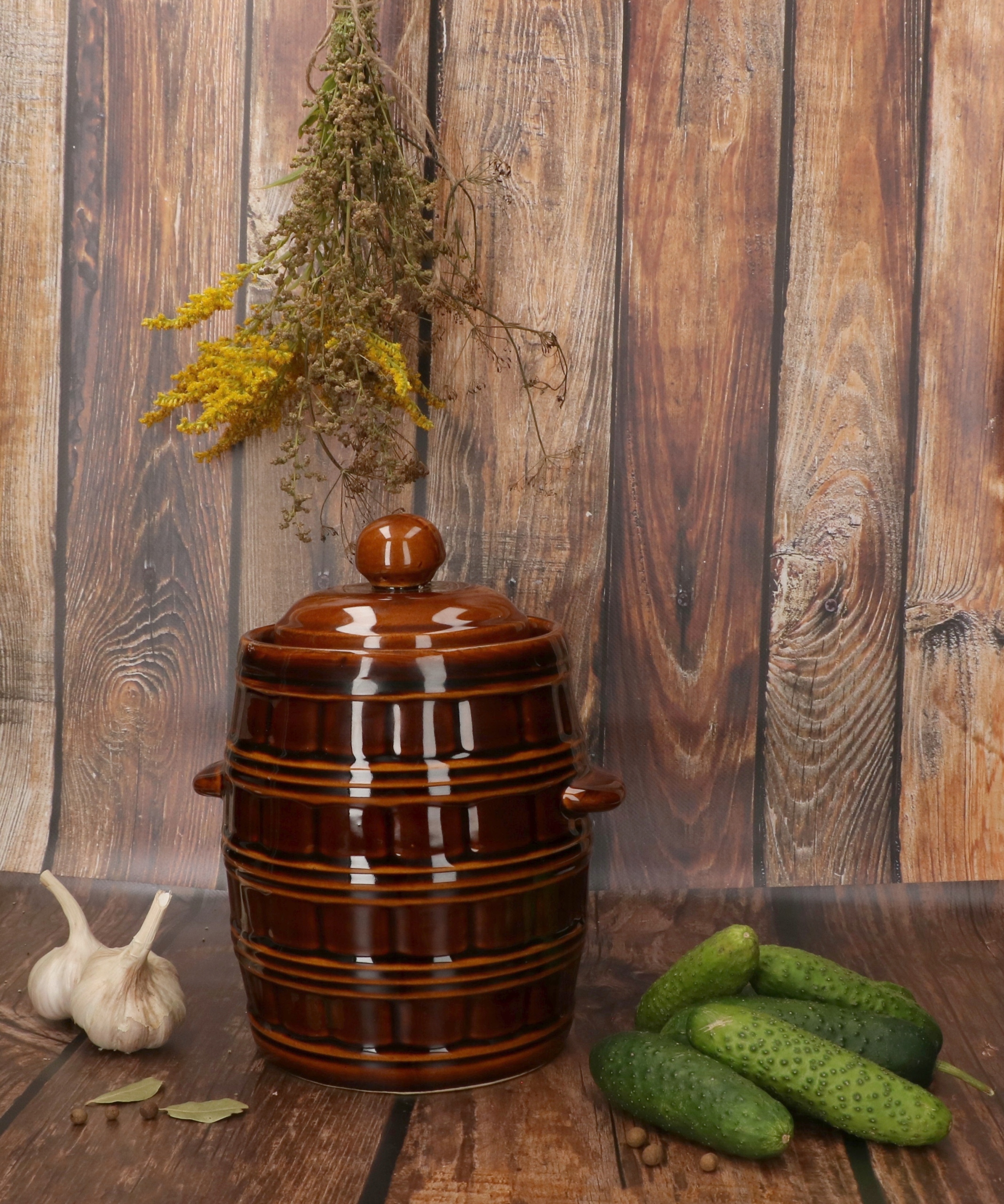 Многофункциональная посуда пригодится на каждой кухне. Идеально подходит для хранения сала и солений. Традиционный вид позволяет вписать его в большинство интерьеров не только домов, но и ресторанов. Керамическая бочка устойчива к кислотам, поэтому особенно подходит для приготовления маринованных огурцов, капусты, перца, грибов и других продуктов.