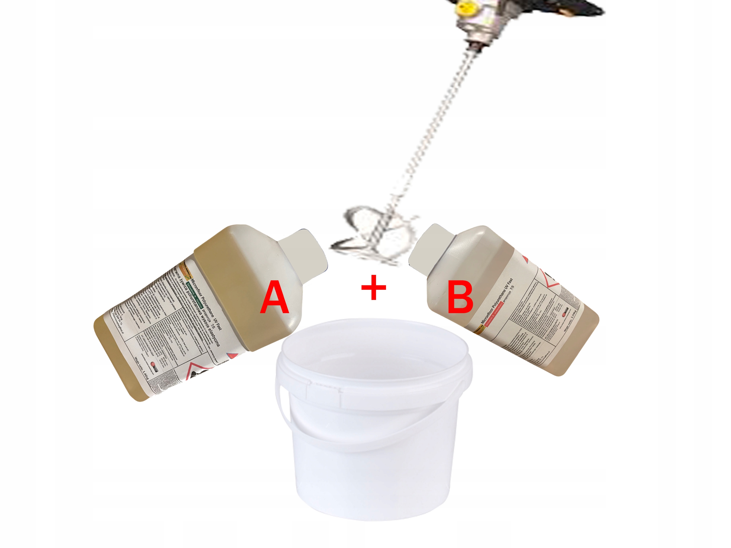 Сначала тщательно перемешайте компоненты УФ-полиуретановой смолы. Для этого берем комплект смолы объемом 2,5 кг, заливаем в одну упаковку компоненты А и Б и перемешиваем тихоходной мешалкой.