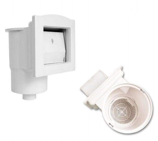 С входной насадкой и переходником для подключения щеткосъемника. Скиммер, подключенный к фильтрации, предназначен для сбора воды из бассейна и передачи ее дальше, а помещенная в него корзина собирает более крупные примеси, например, листья. В стандартный комплект входят насадки, насадка, заслонка, адаптер и корзина.