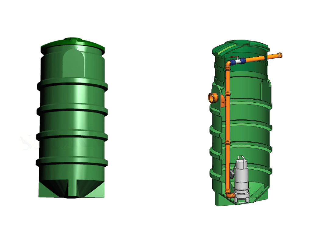 Насосная станция состоит из сборного резервуара, в который собираются сточные воды, и автоматического насоса (доступен в качестве опции), перекачивающего сточные воды далее сверх необходимого перепада уровней. Насосные станции могут быть установлены перед септиком или станцией биологической очистки.