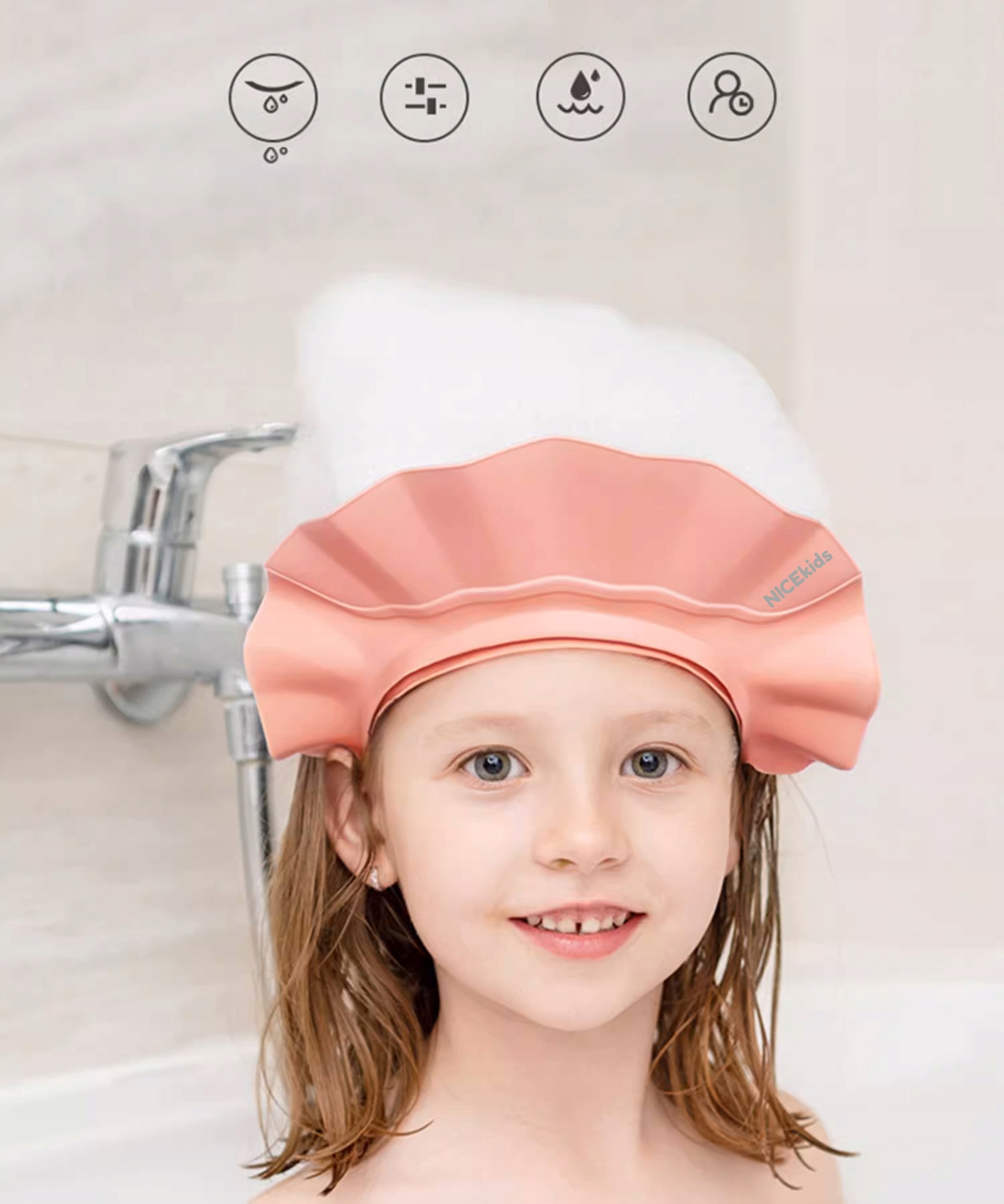 Благодаря специально разработанной запатентованной конструкции, сочетанию двух материалов (жесткого козырька и мягкого силикона), козырек защитит глаза, уши и лицо ребенка перед подачей воды и шампуня. Нежная розовая отделка придает нашему изделию шарм и элегантность.